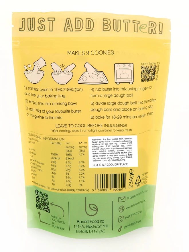 Easy to make, delicious to taste. Simply add the recommended amount of plant-based spread, margarine or butter to your mix, mix into dough balls, and bake. The result is a colourful, crunchy cookie that's sure to brighten up any occasion.