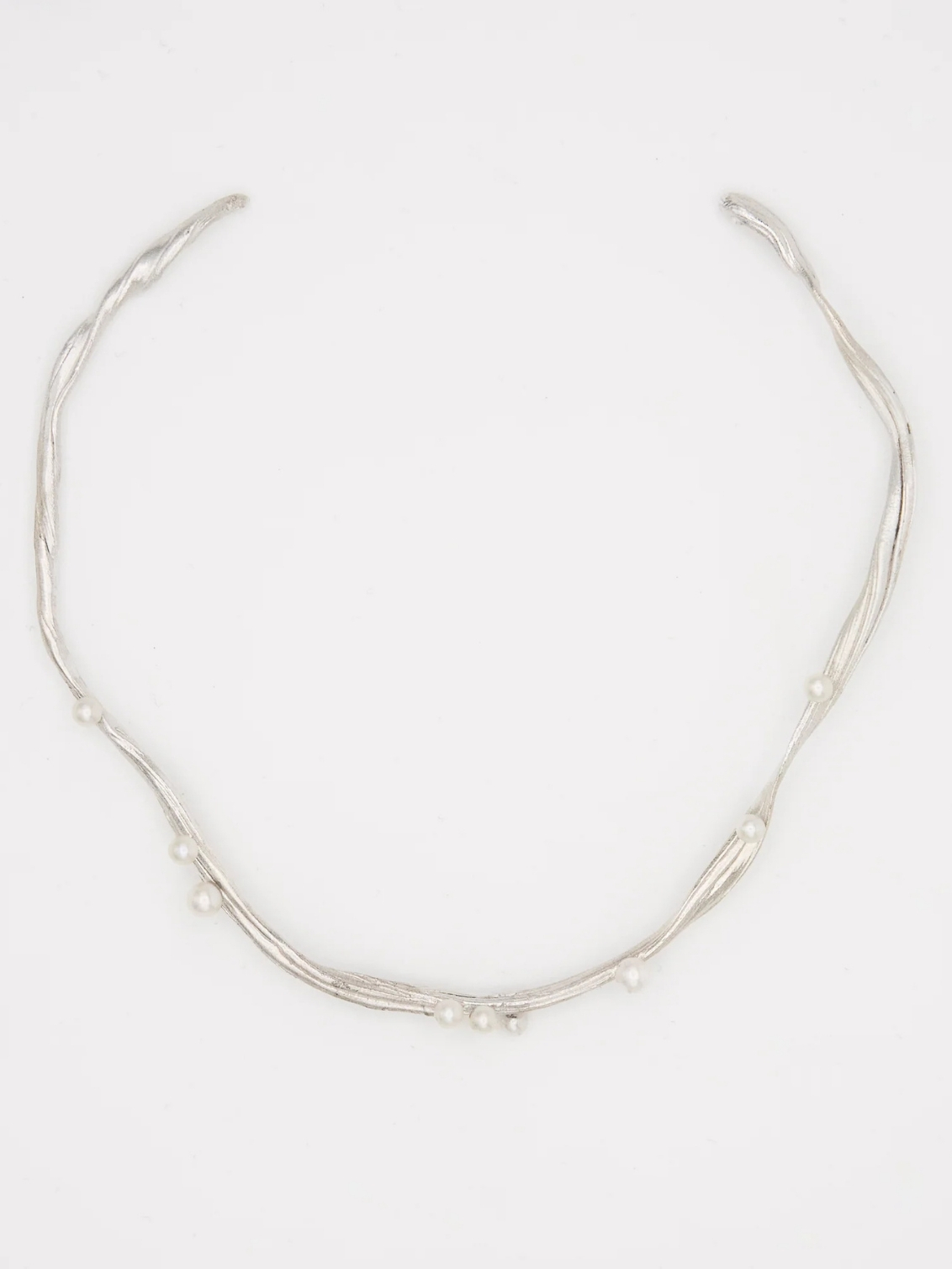 This necklace draws inspiration from the abundant, twisting branches of a forest, reaching outward in graceful forms that evoke the layered beauty of a vibrant canopy. The choker flows in organic, vine-like shapes. Delicate pearls are artfully set along t...