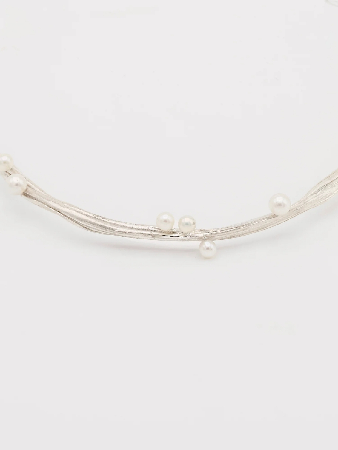 This necklace draws inspiration from the abundant, twisting branches of a forest, reaching outward in graceful forms that evoke the layered beauty of a vibrant canopy. The choker flows in organic, vine-like shapes. Delicate pearls are artfully set along the curve, resembling clusters of fresh blossoms clinging to the branches.
