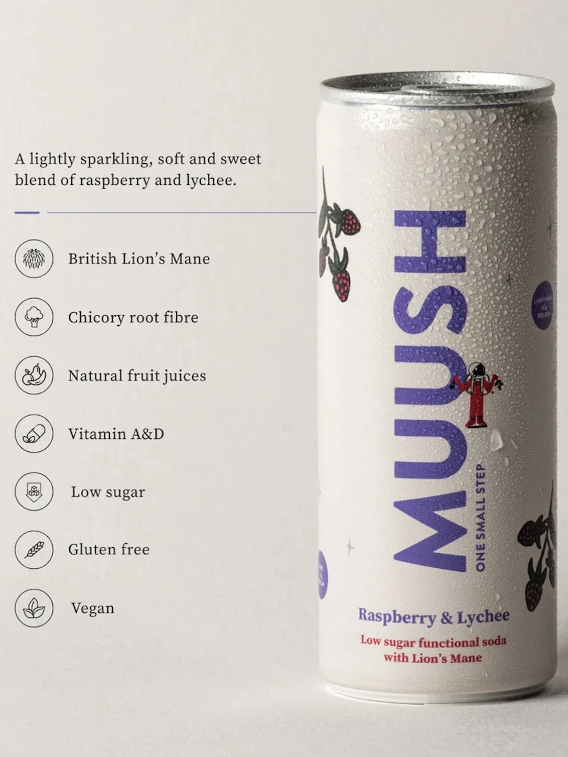 Not your average soda. A soft and sweet blend of raspberry and lychee. Infused with premium Lion’s Mane mushroom to support cognitive function, immunity and gut health...