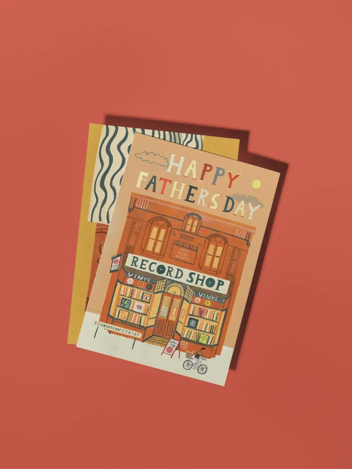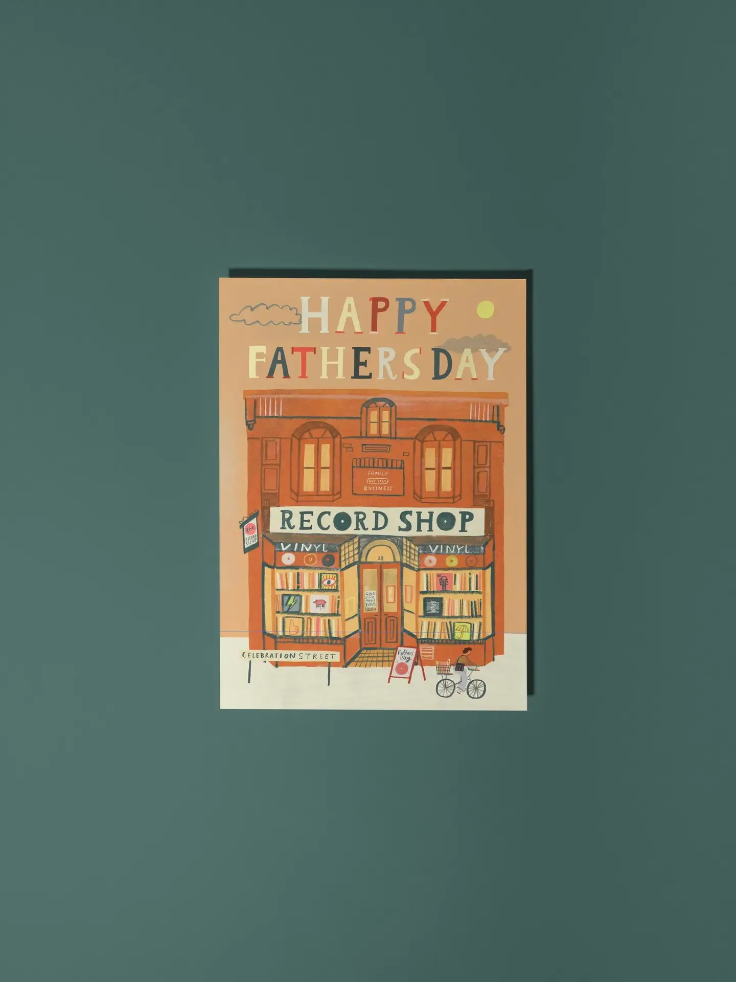Illustrated card featuring an eclectic vinyl record shop. Perfect for celebrating your music-loving Dad!
