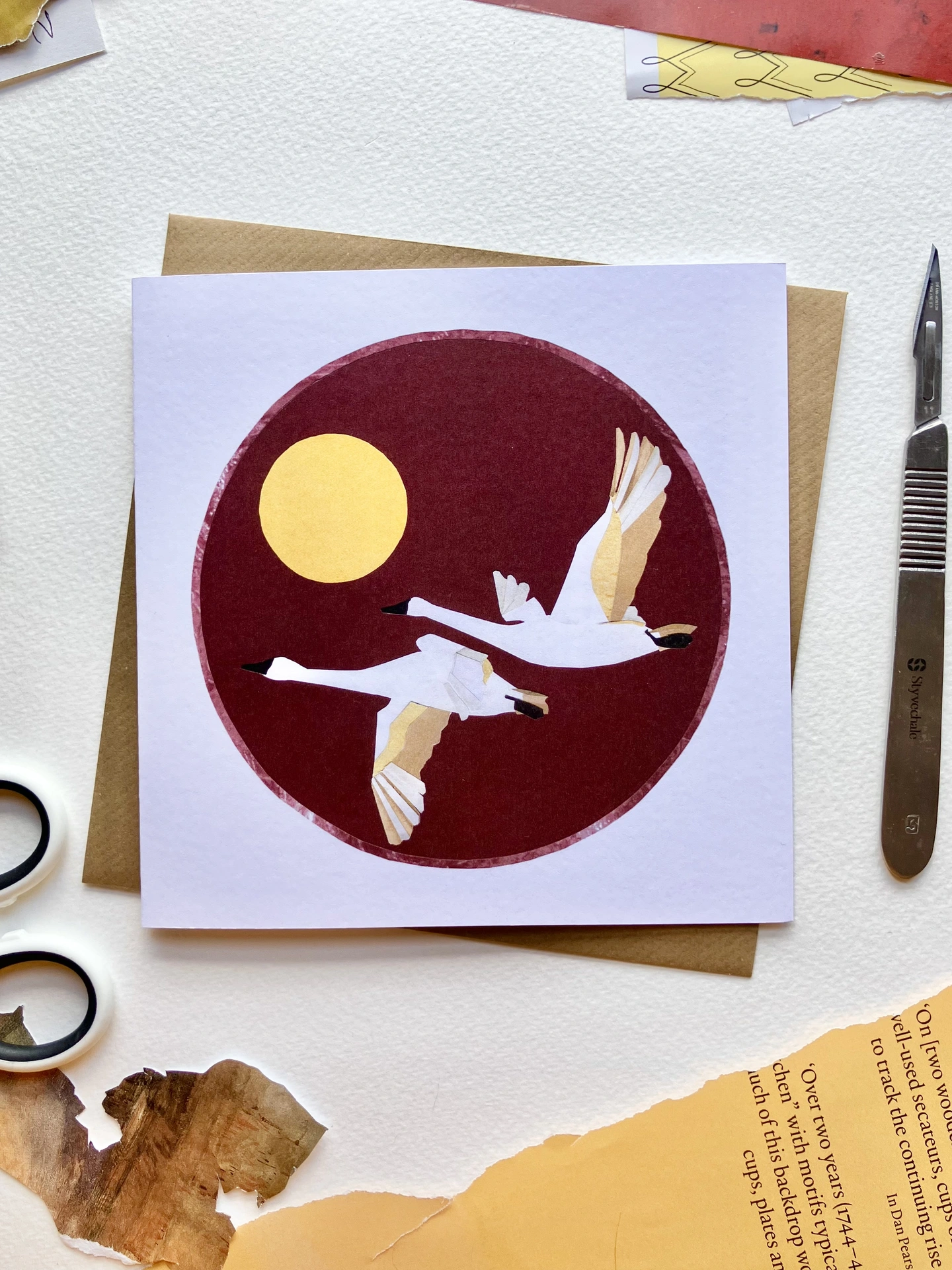 Recycled Paper Collage 'Sunset Swans' Greetings Card