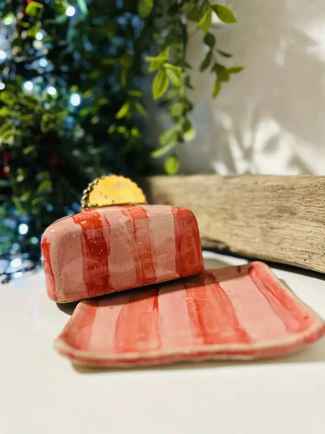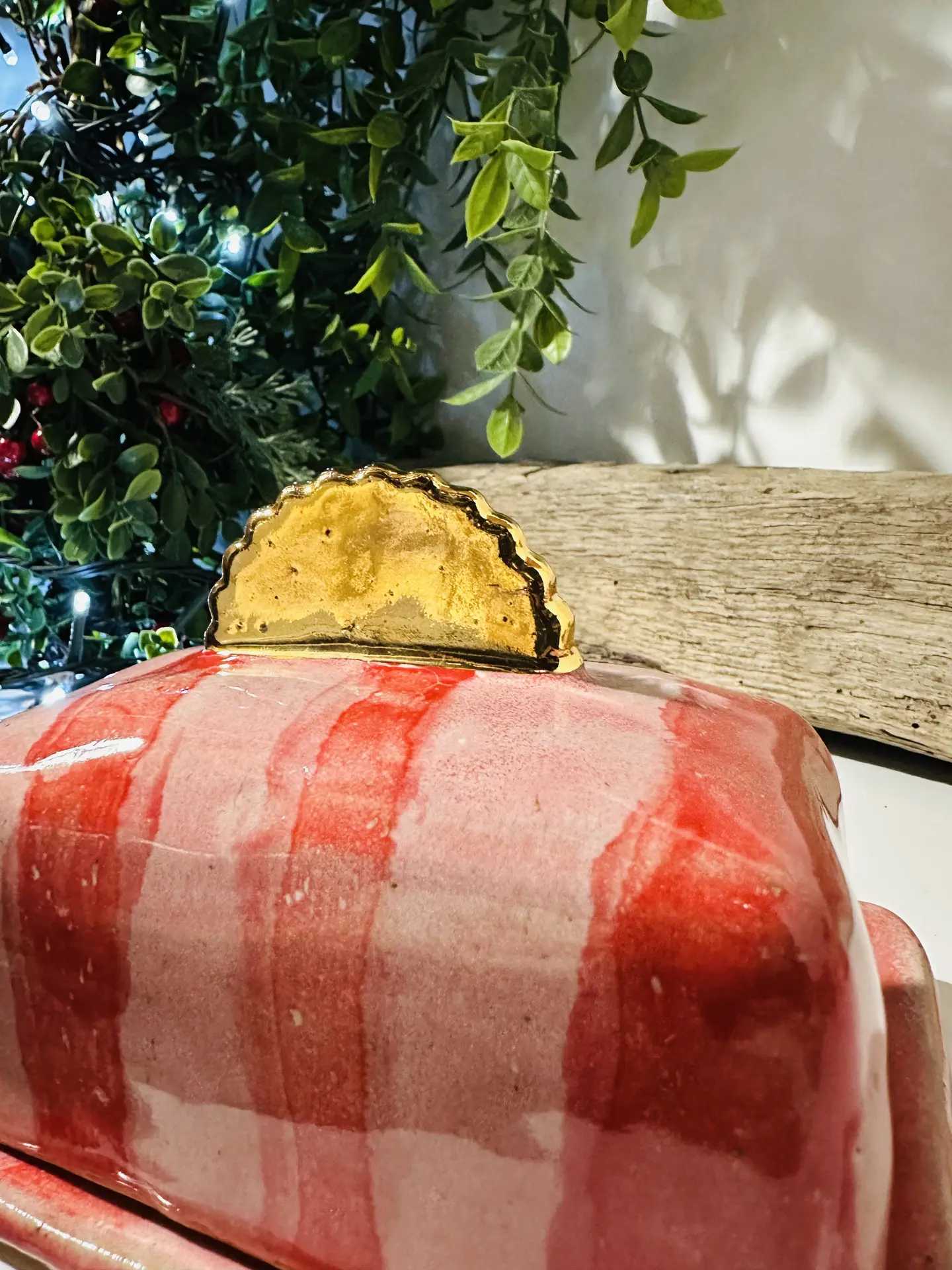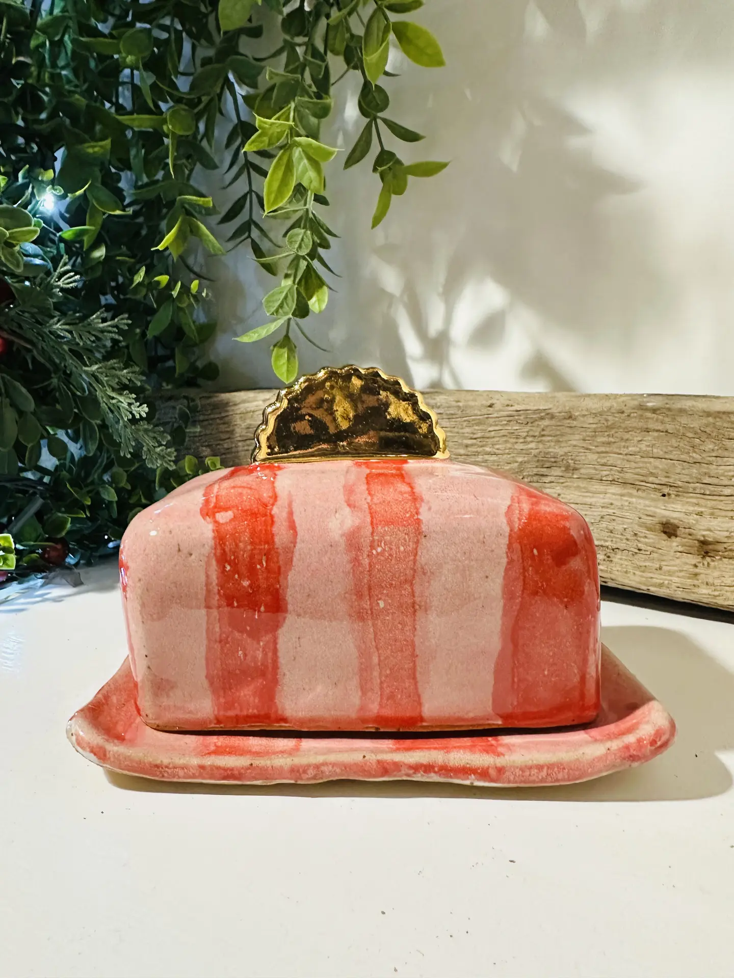 Add a splash of whimsy to your kitchen with this vibrant hand made ceramic butter dish, featuring bold pink and red stripes with a sculpted green bird perched proudly on top. The bird rests on a delicate scalloped disc accented with hints of soft blue, adding an extra pop of colour and character . Funky and full of personality, made in small batches each piece is both functional and decorative - perfect to brightening up your breakfast table.