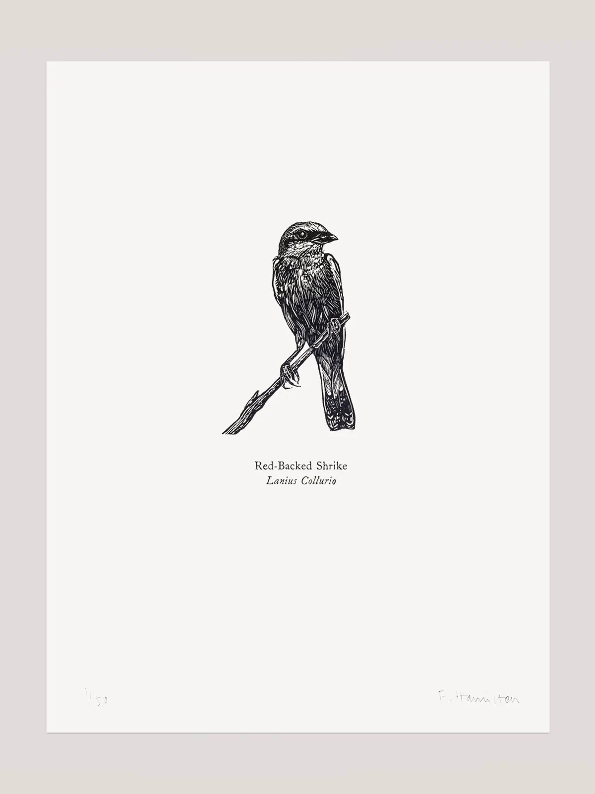 This original art print is a wood engraving of a Red-Backed Shrike. It is a very detailed illustration using fine wood engraving tools on a highly carved piece of maple wood. Below the engraving is the title in letterpress text...