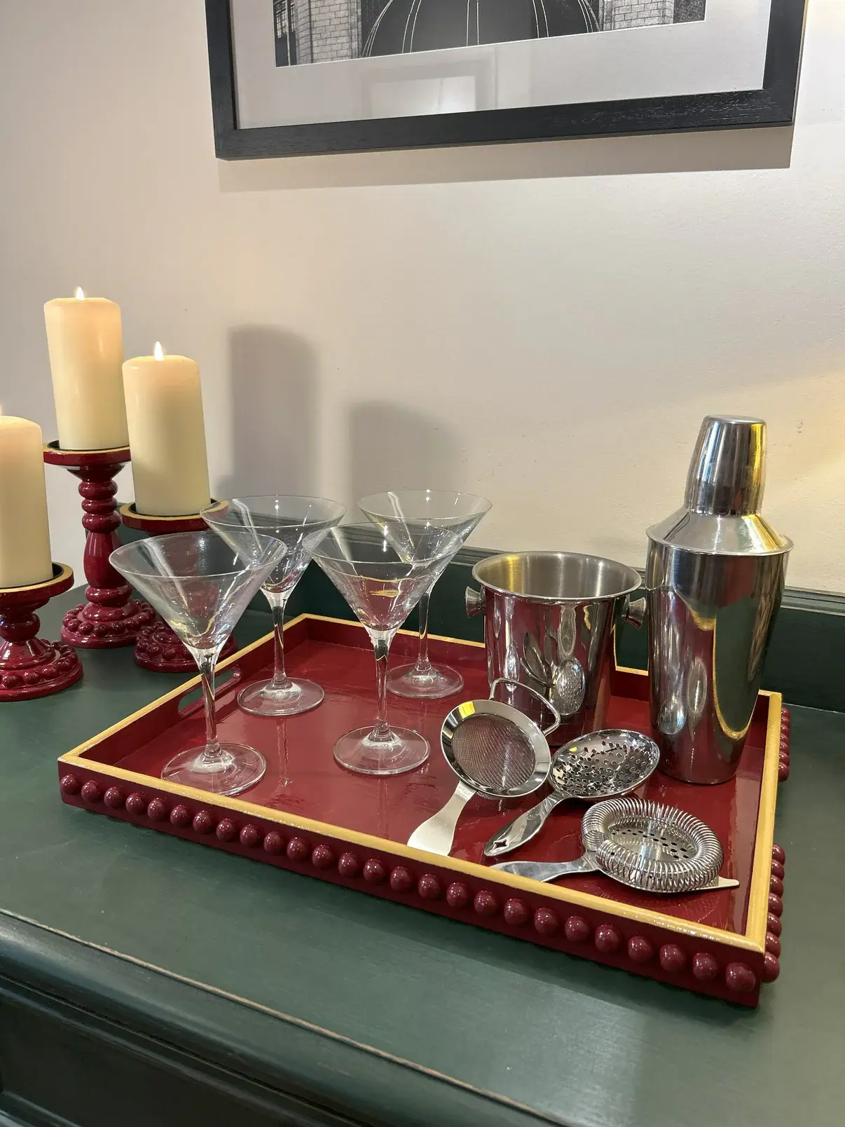 Beautiful deep red rectangular coffee table tray with handles. Perfect for an ottoman or coffee table. Excellent house warming gift.