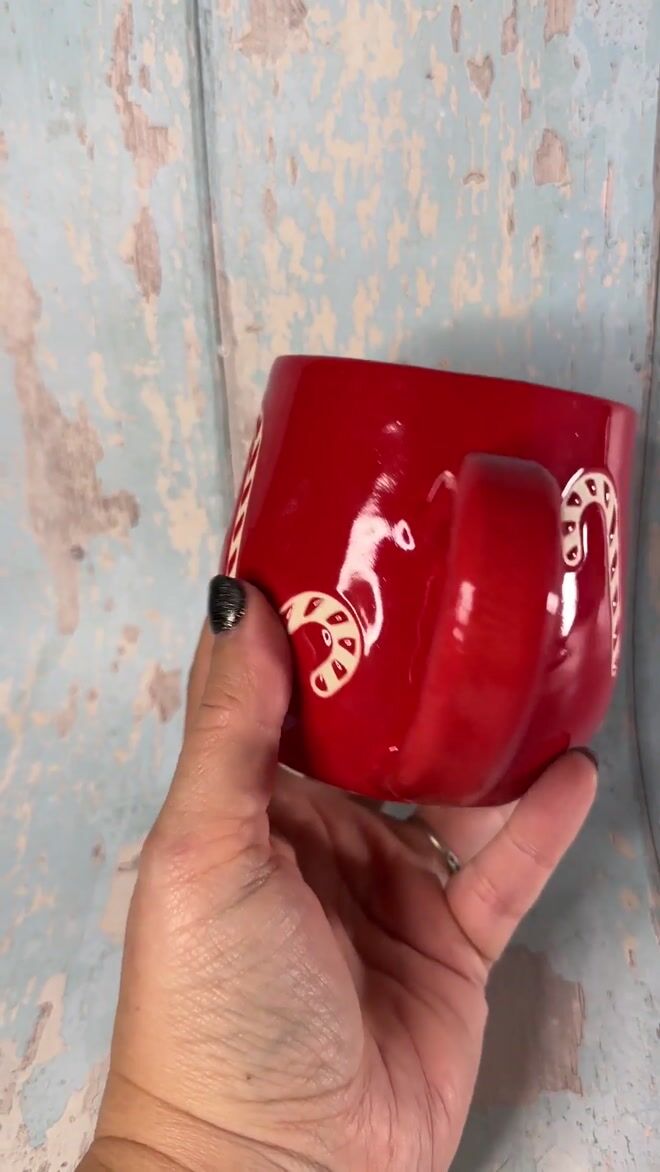 This one of a kind Christmas mug is made from white stoneware clay with white candy canes and a red glaze.