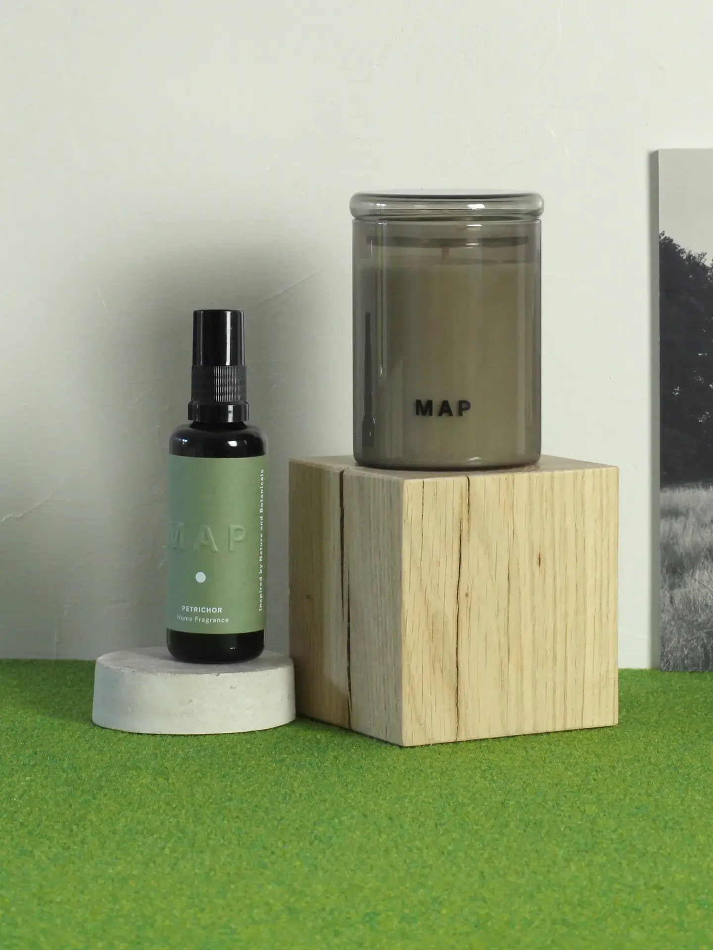 The MAP 'Rest' set contains the 'Blue Fields' soy wax candle and 'Petrichor' home fragrance spray.
