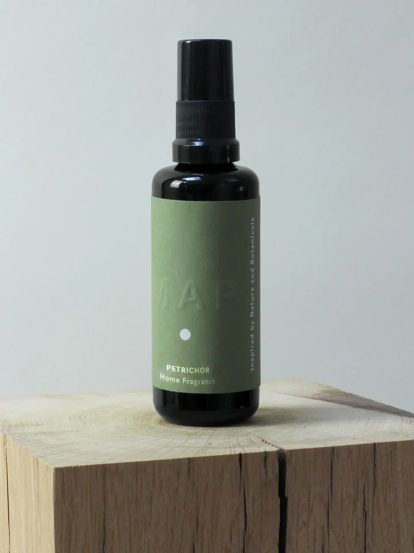 Home fragrance spray made with patchouli, lavandin and petitgrain for a deep earthy base, mixed with aqua and citrus tones. 'Petrichor' is born from the distinctive aroma that rises from the ground after it rains. Freshness and new oxygen surfaces to renovate the air.