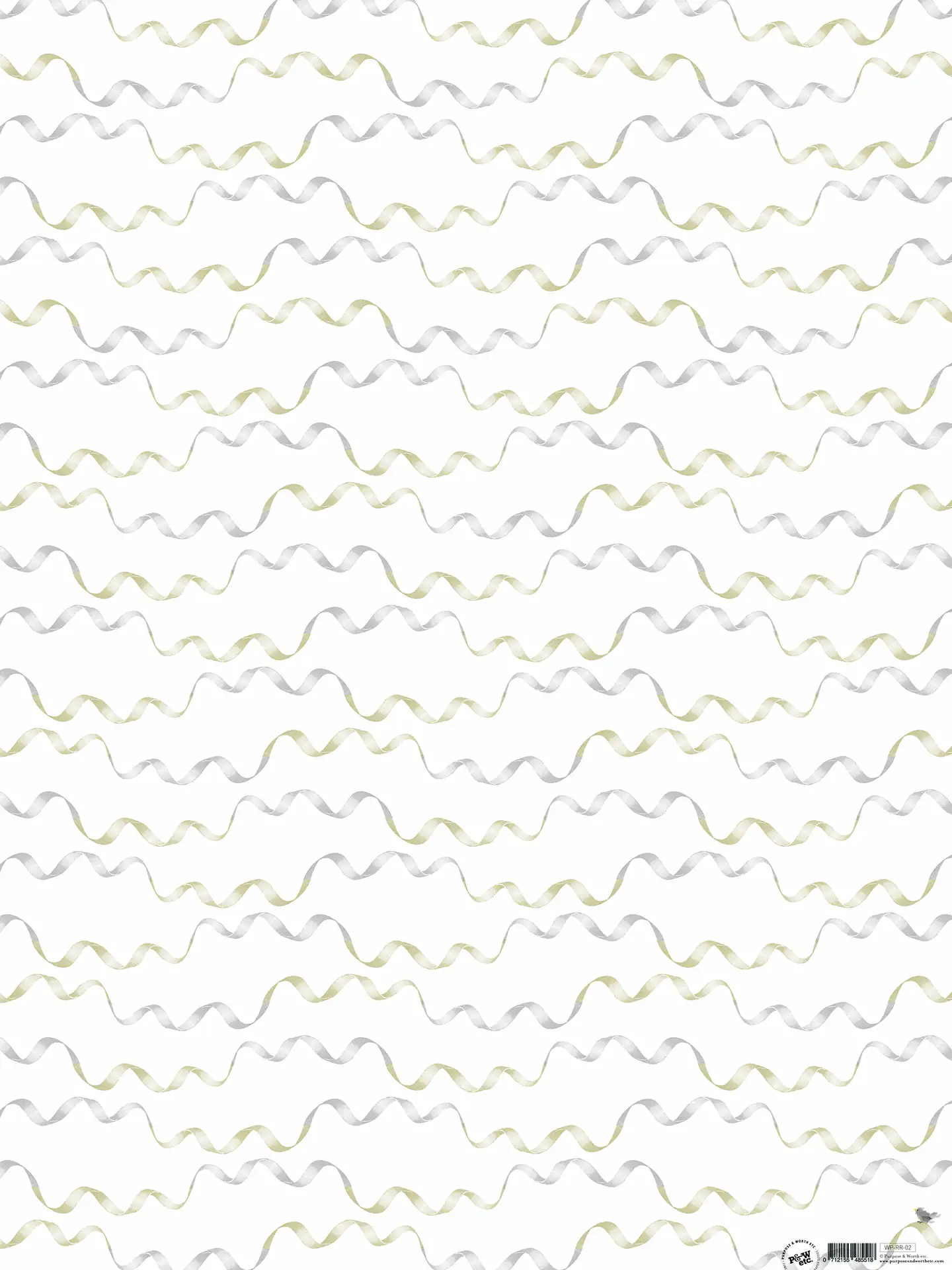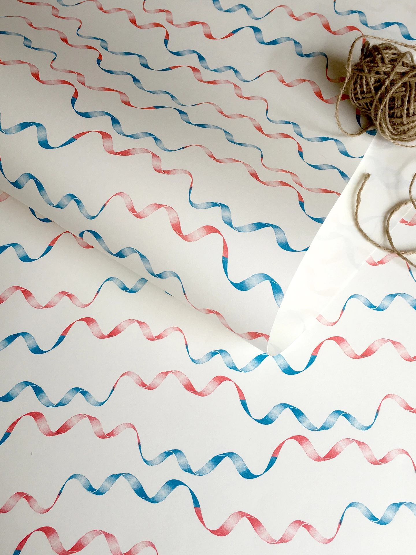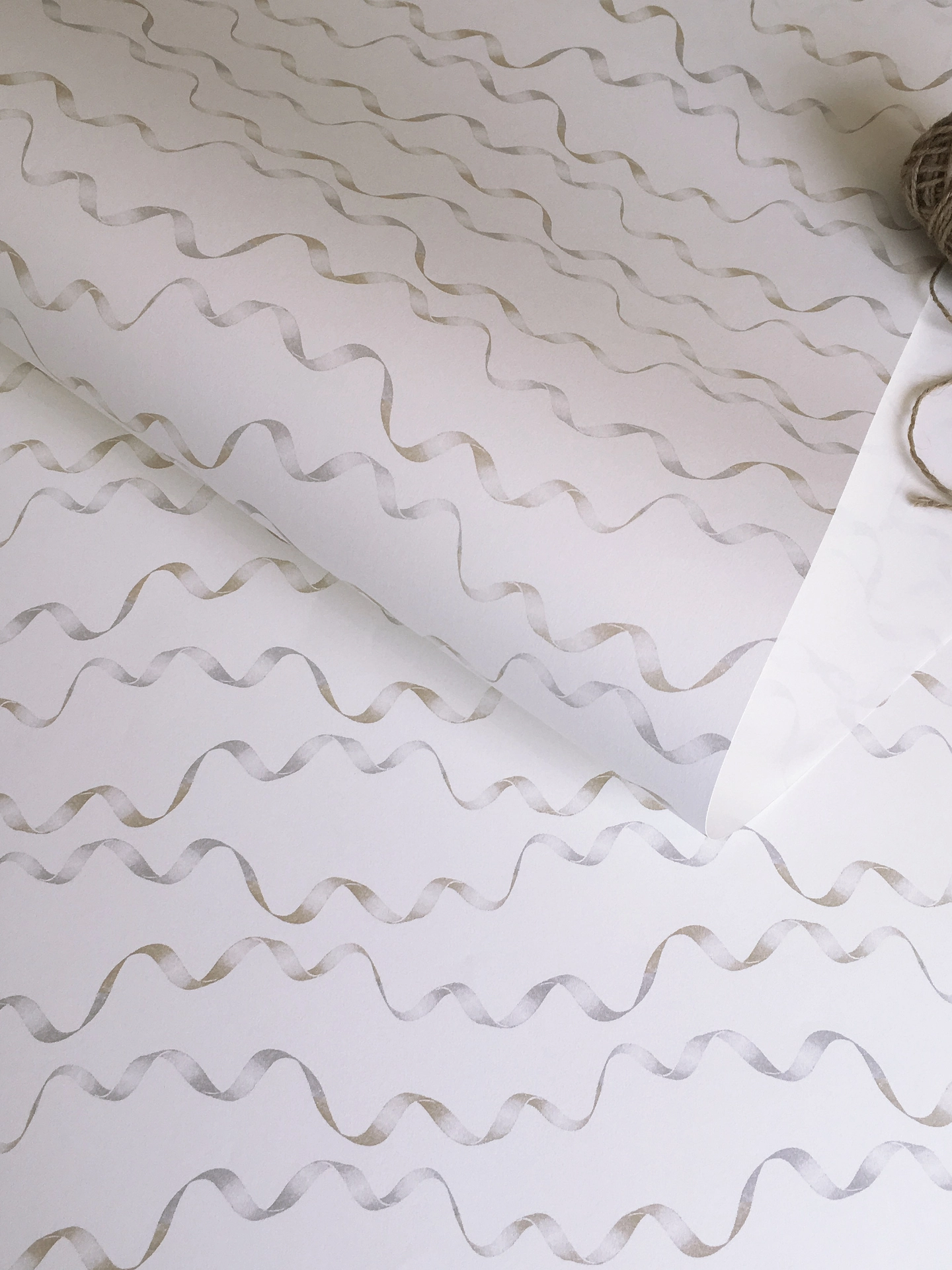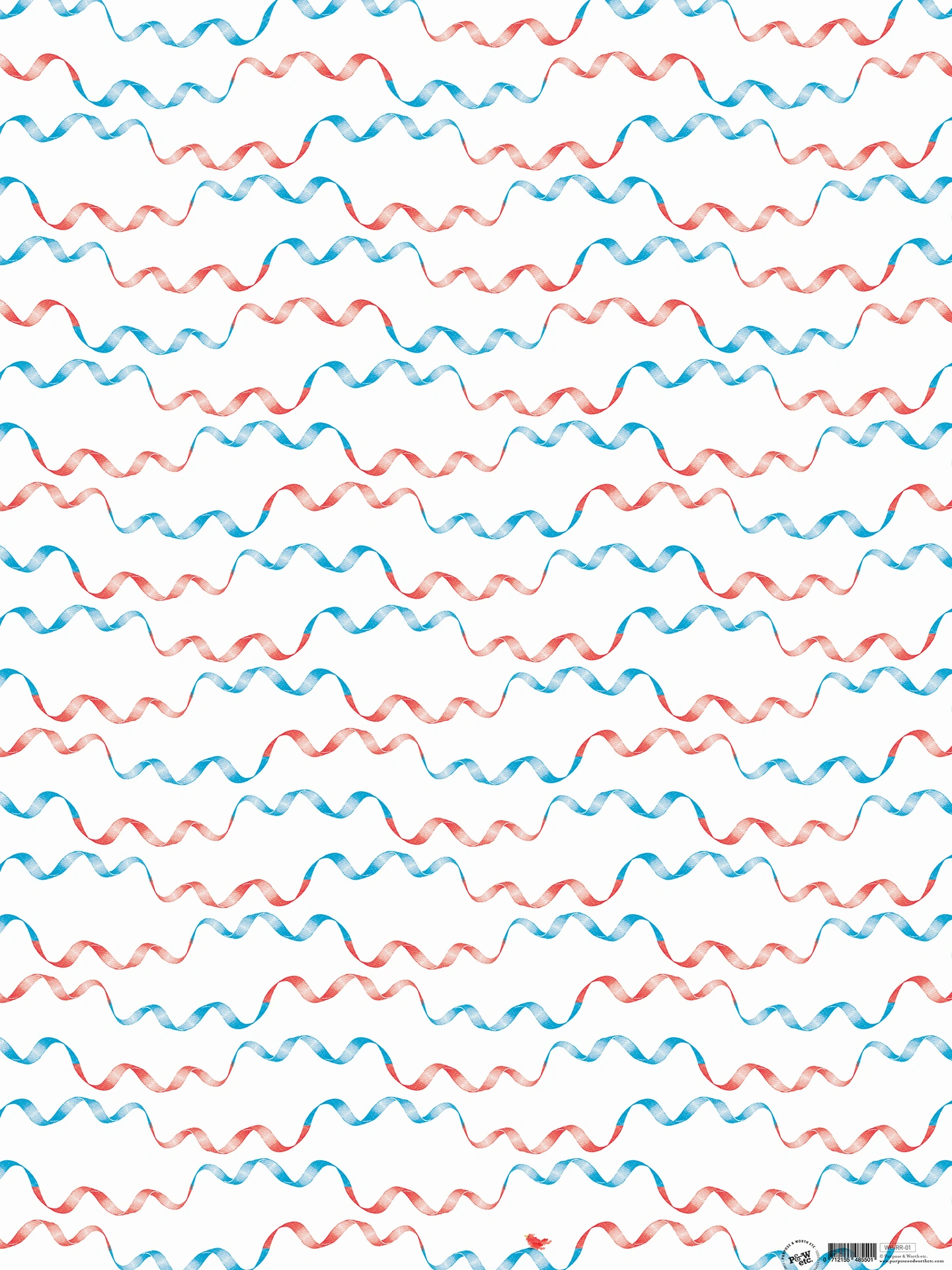 Stylish retro ribbon design wrapping paper in two colourways: red and blue and silvery and golden (printed not metalic).