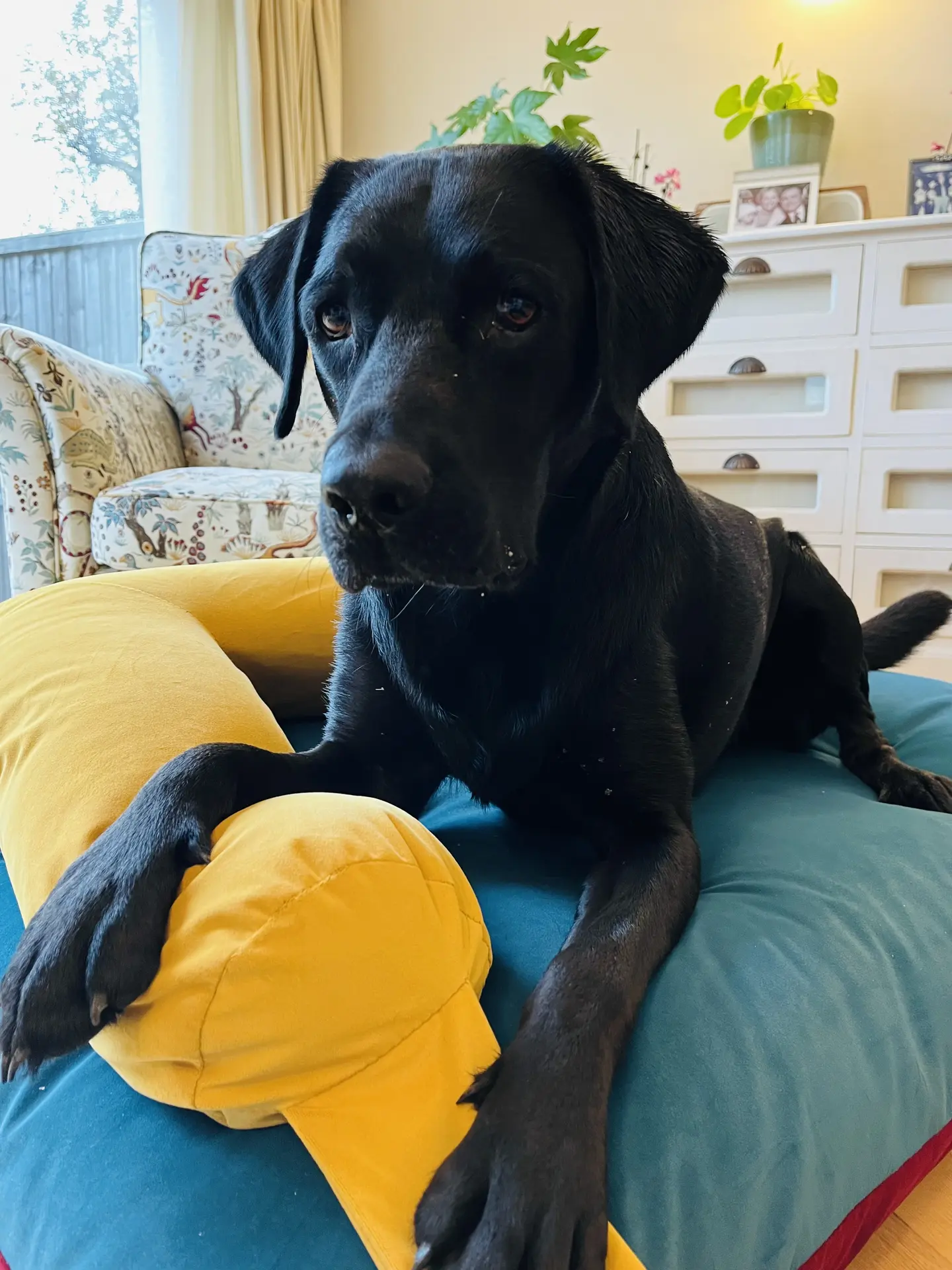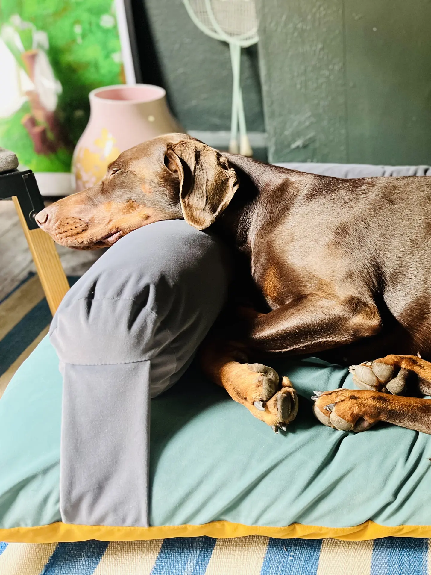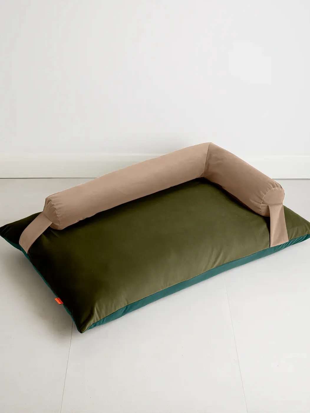 Our K-9 Candy Bed has everything you could want for your K-9 companion. Including a bolster that flips over, to switch up the mattress colour on top. Our mattresses are thick and gusseted to prevent unwanted collapse of the hand blown recycled polyester fibre fill. Which is in itself very dense and therefore of an orthopaedic nature. And there's plenty of it so your K-9 companion is always supported! They are individually handmade to order in London.