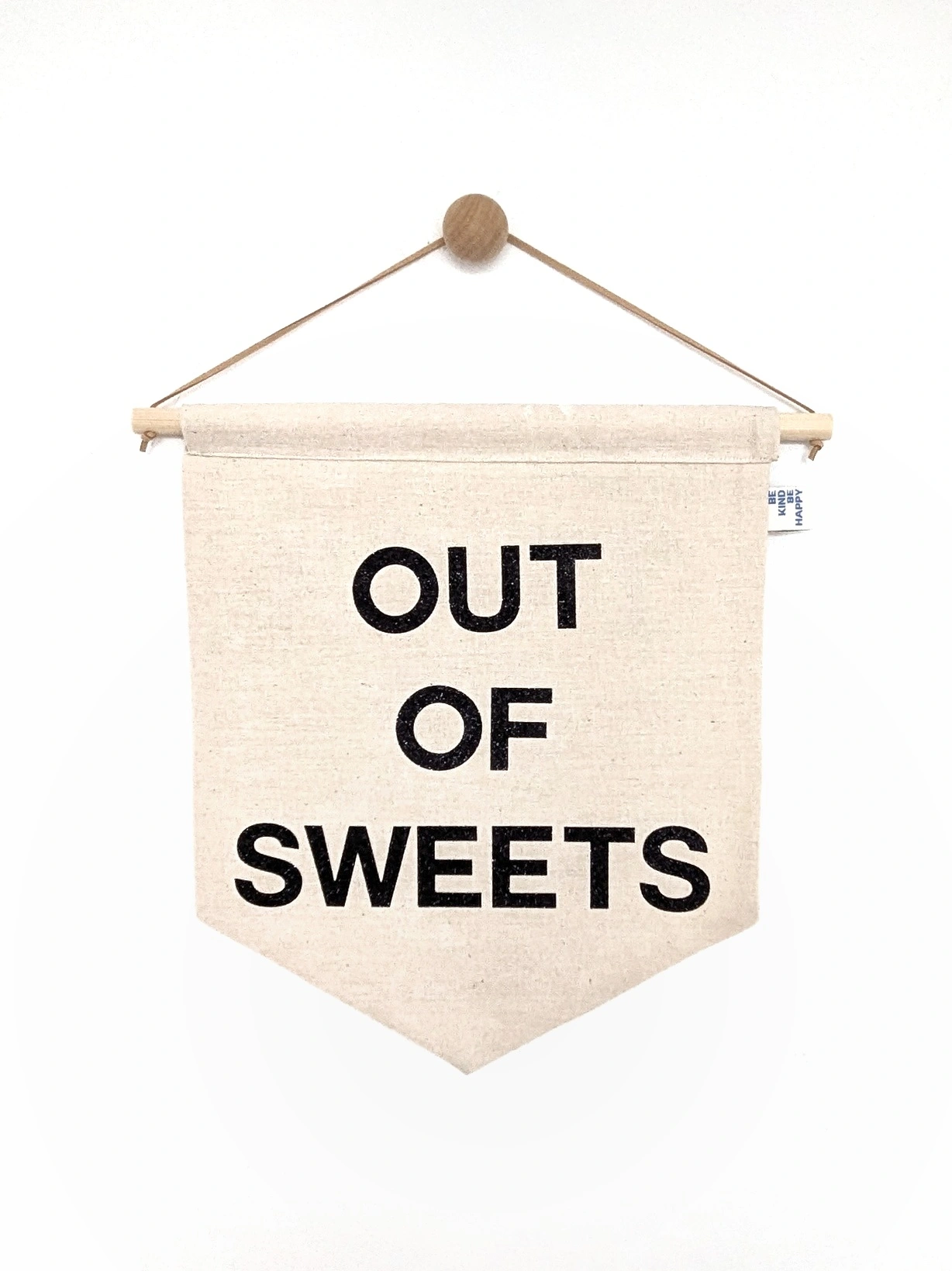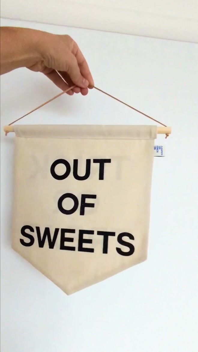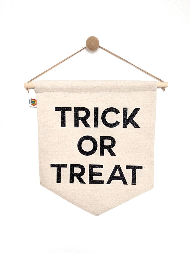 Black glitter printed onto a reversable cotton base, finished with a wooden dowel and vegan leather strap for easy hanging.