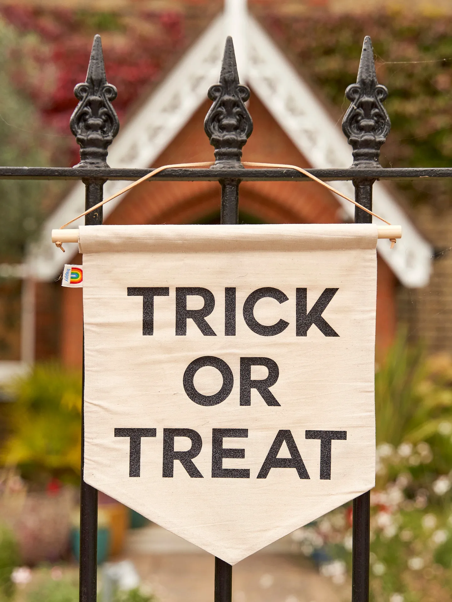 This handmade reversible Halloween banner says “Trick or Treat” on one side (let the ghouls and ghosts know they’re welcome!) and flips to “Out of sweets” on the other when the treats have run out.