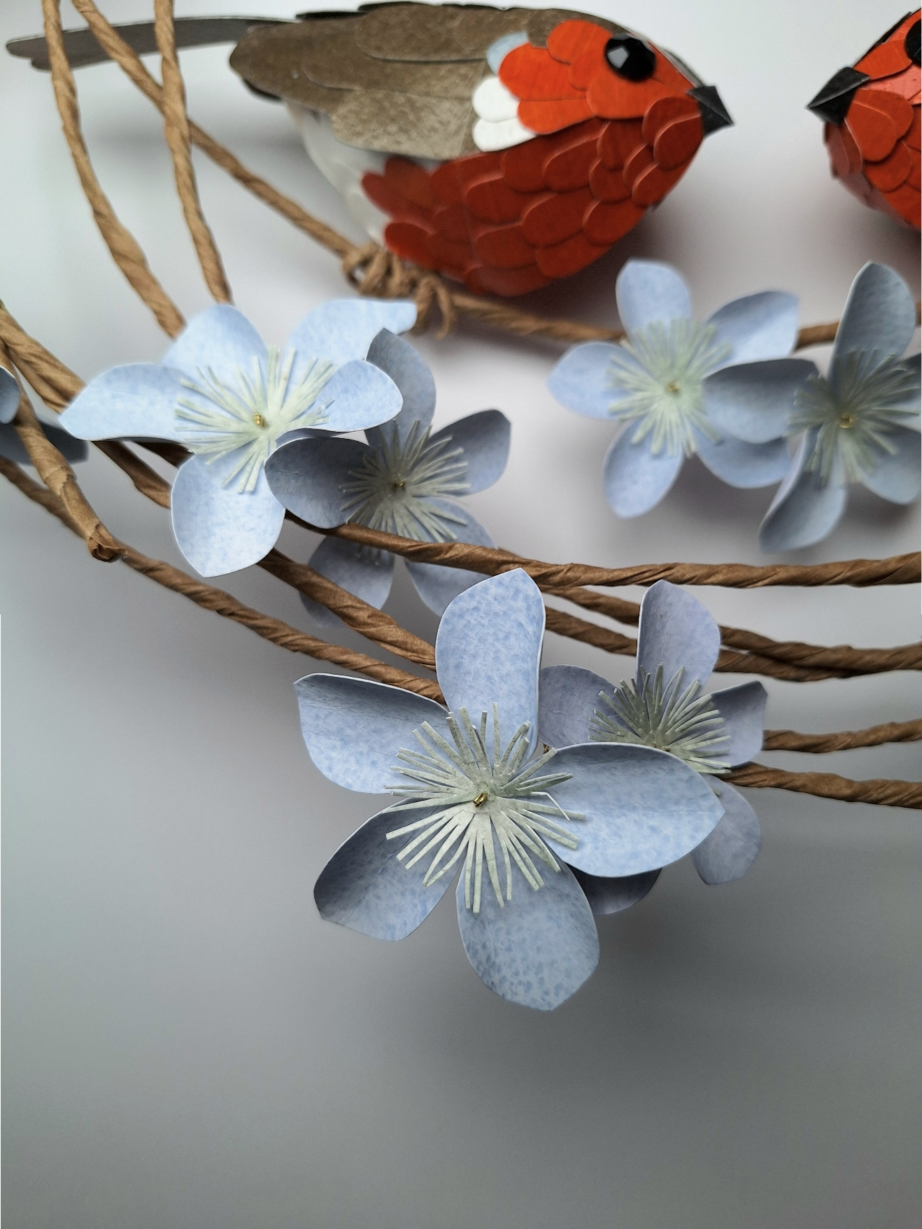 The ice blue flowers are dotted around the wreath in pairs. They have pale green middles. These intricate flowers are also cut and shaped by hand.