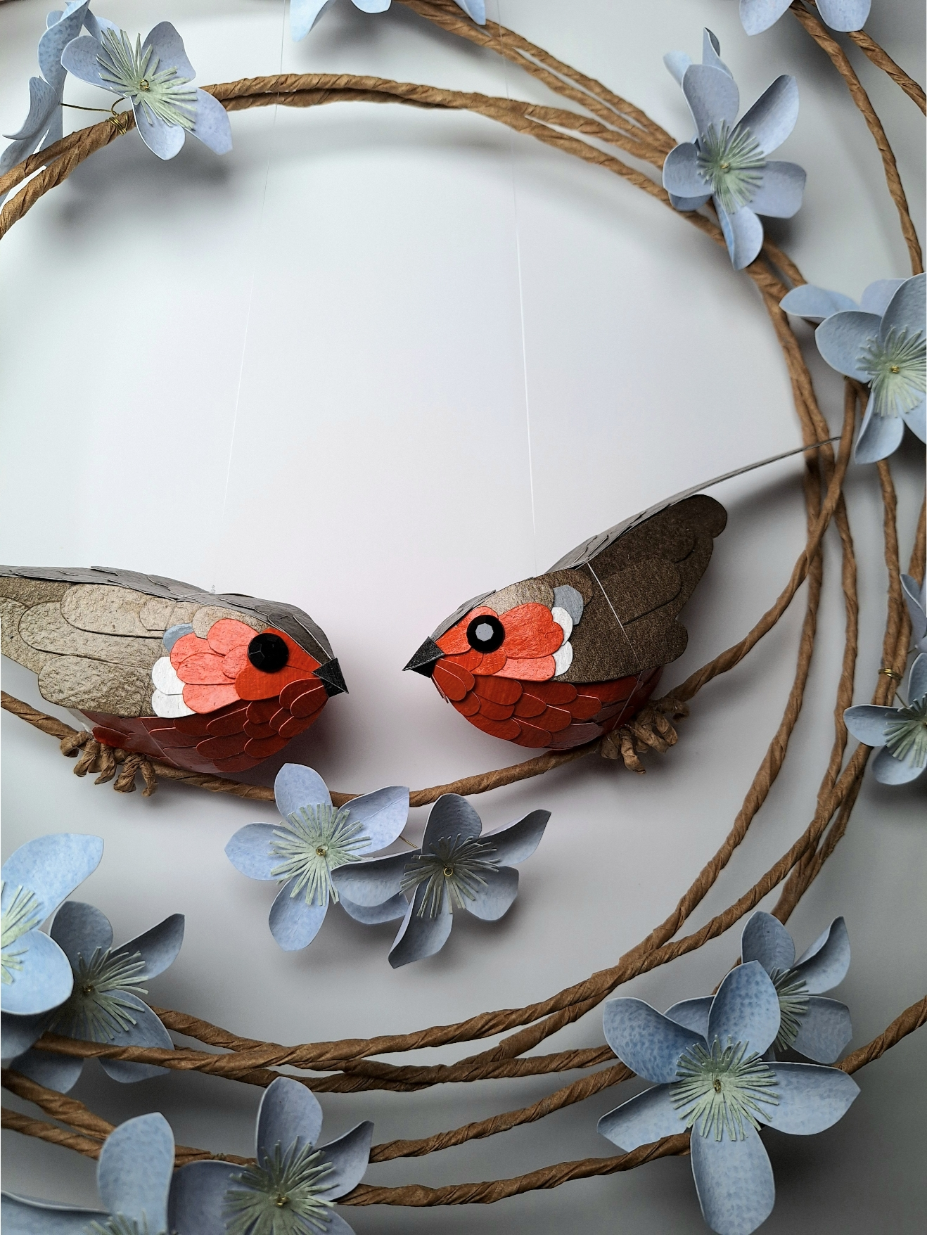 The robins are made from handprinted papers in orange/red, brown and white. They are covered in hand cut feathers and made entirely by hand, making their pose and expression unique. I have used the same hand printed papers, so that their colours match perfectly.