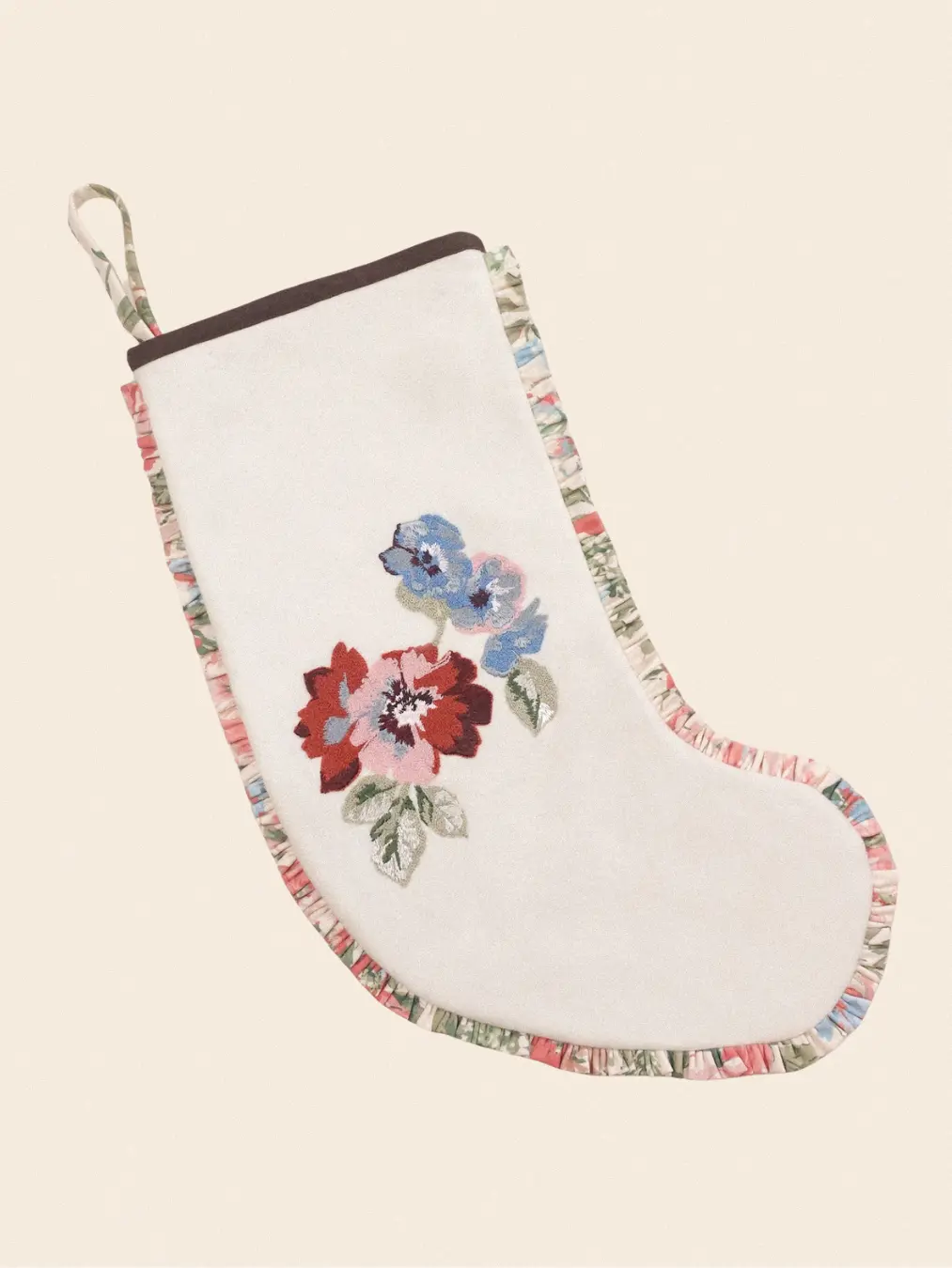 Handcrafted from 100% ivory wool. Our Rosa stockings features a chainstitch rose embroidery and signature ruffle edge in vintage chintz. Fully lined heirloom-quality, perfect for handing down through generations.