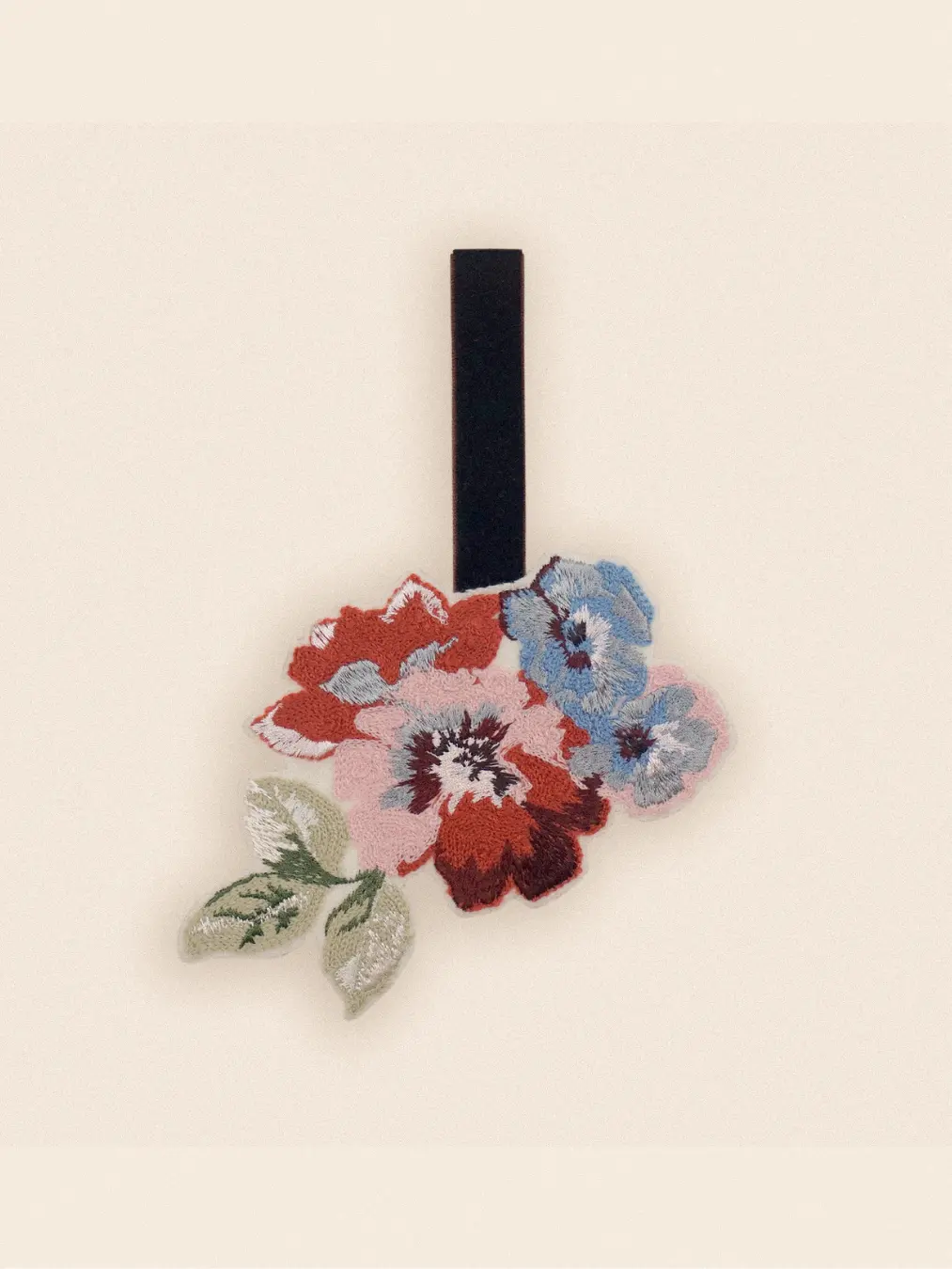 Our Rosa Christmas decoration features a mix of cotton chainstitch and intricate satin stitch embroidery. Made on ivory wool off-cuts and finished with a luxurious chocolate brown velvet ribbon. Made in Scotland