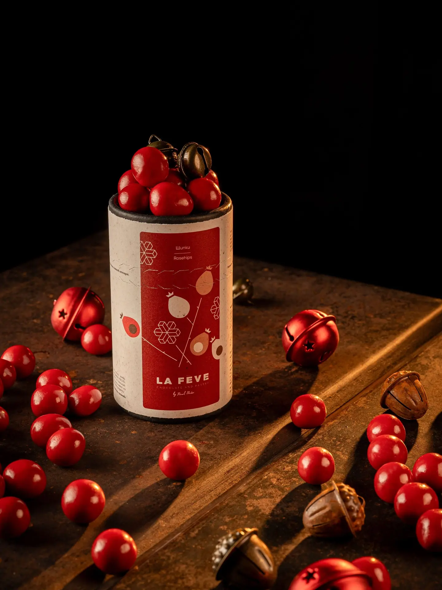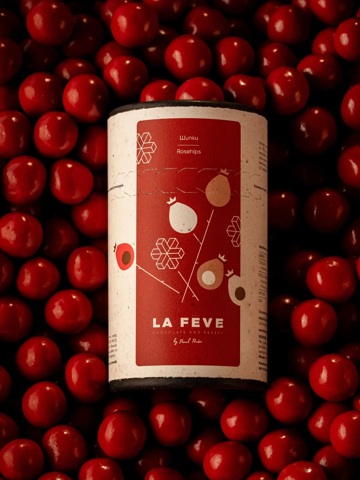 At their heart is a rosehip ganache: the fruit of the wild rose, gathered after the bloom has faded. Rosehips bring a flavour both bright and nostalgic — tangy like red berries, yet softened by gentle floral notes.