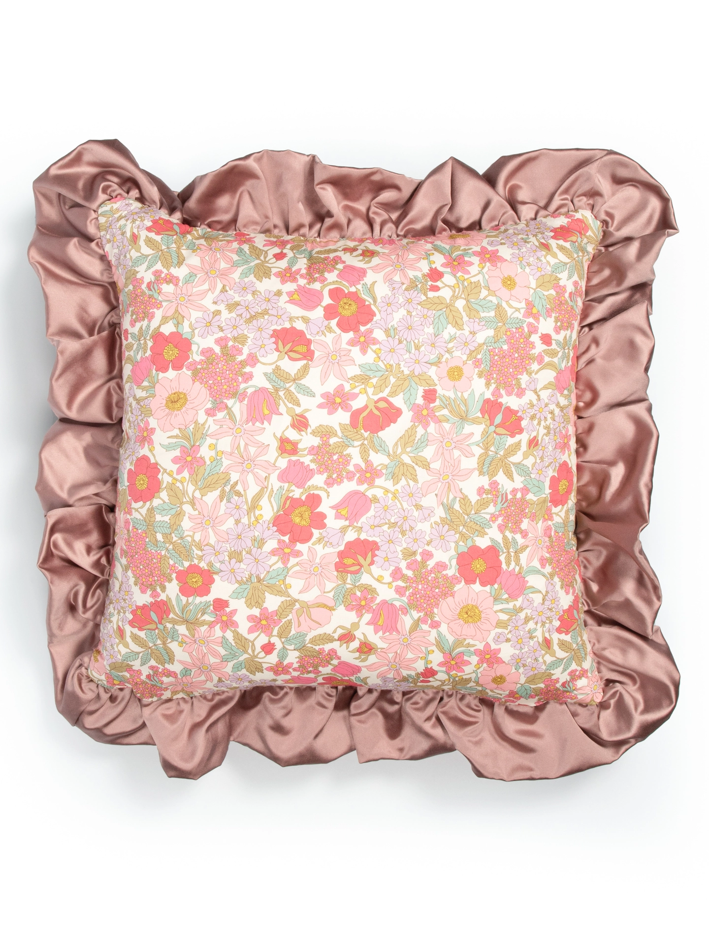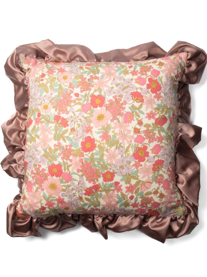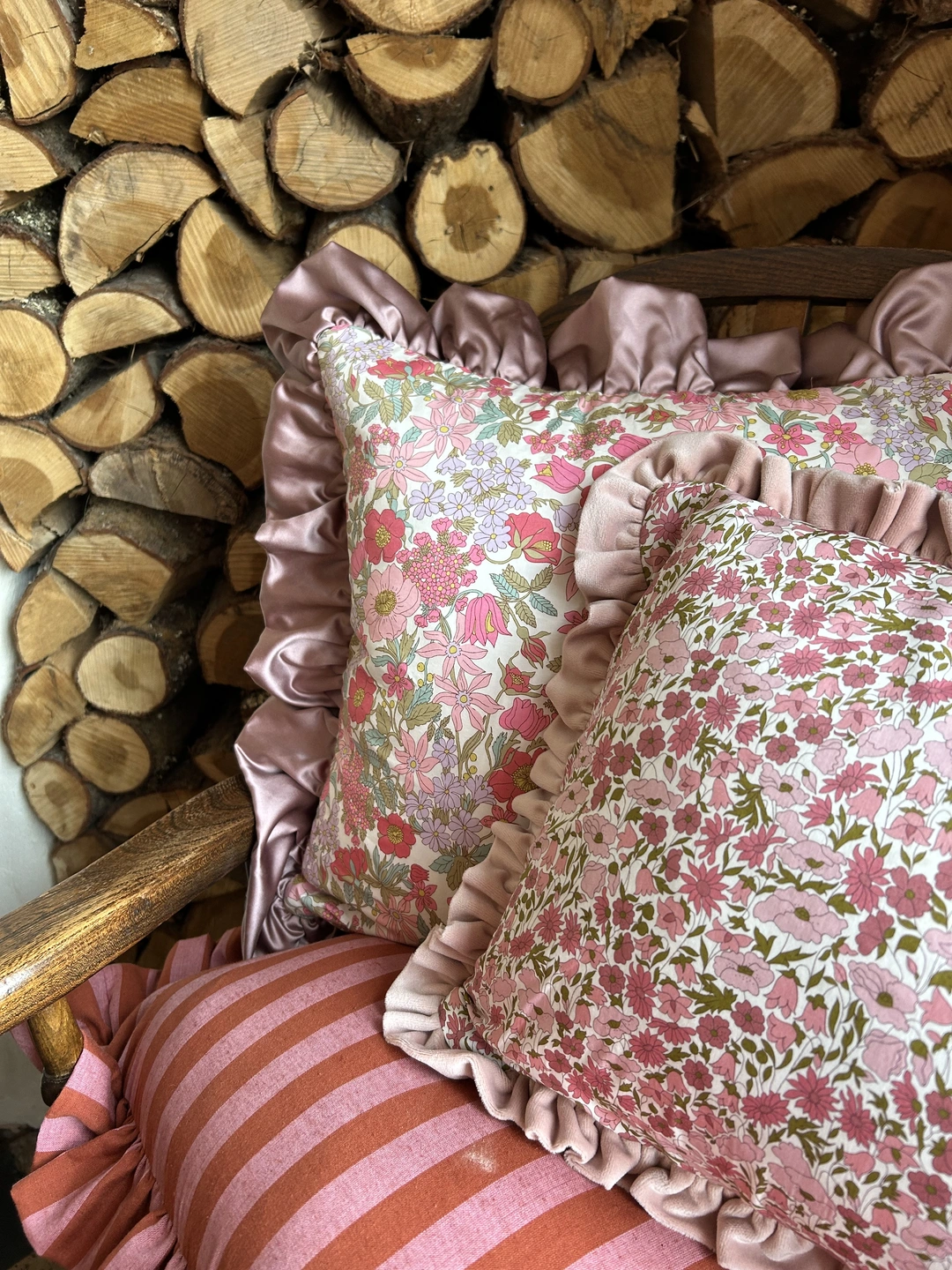 This truly scrumptious cushion is handmade from Liberty of London fabric ‘Clarabell’ and finished with a decadent frill in dusty pink satin. This pretty cushion will add a playful touch to any room.