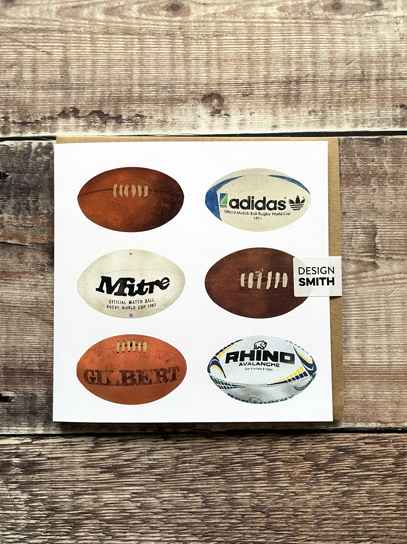This greetings card features our 'Rugby' illustration and features an illustrated collection of six vintage rugby balls, each carefully hand-drawn to capture their unique character and well-worn charm. From stitched leather panels to faded markings, every detail reflects the craftsmanship and history of these classic sporting objects.