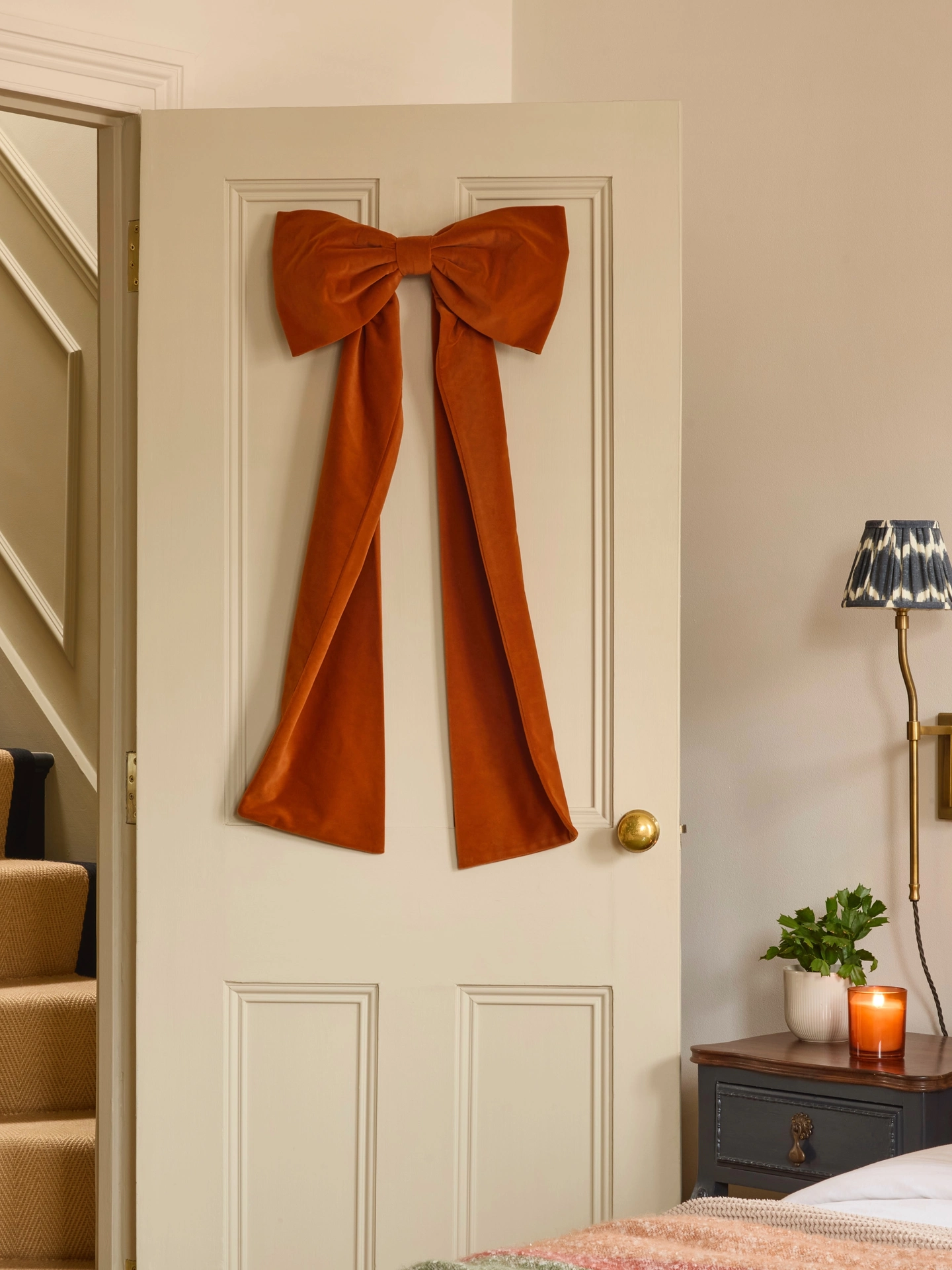 Add a touch of Autumnal elegance with our luxurious velvet bow, perfect for enhancing doors, bannisters, mantels, trees, and mirrors.