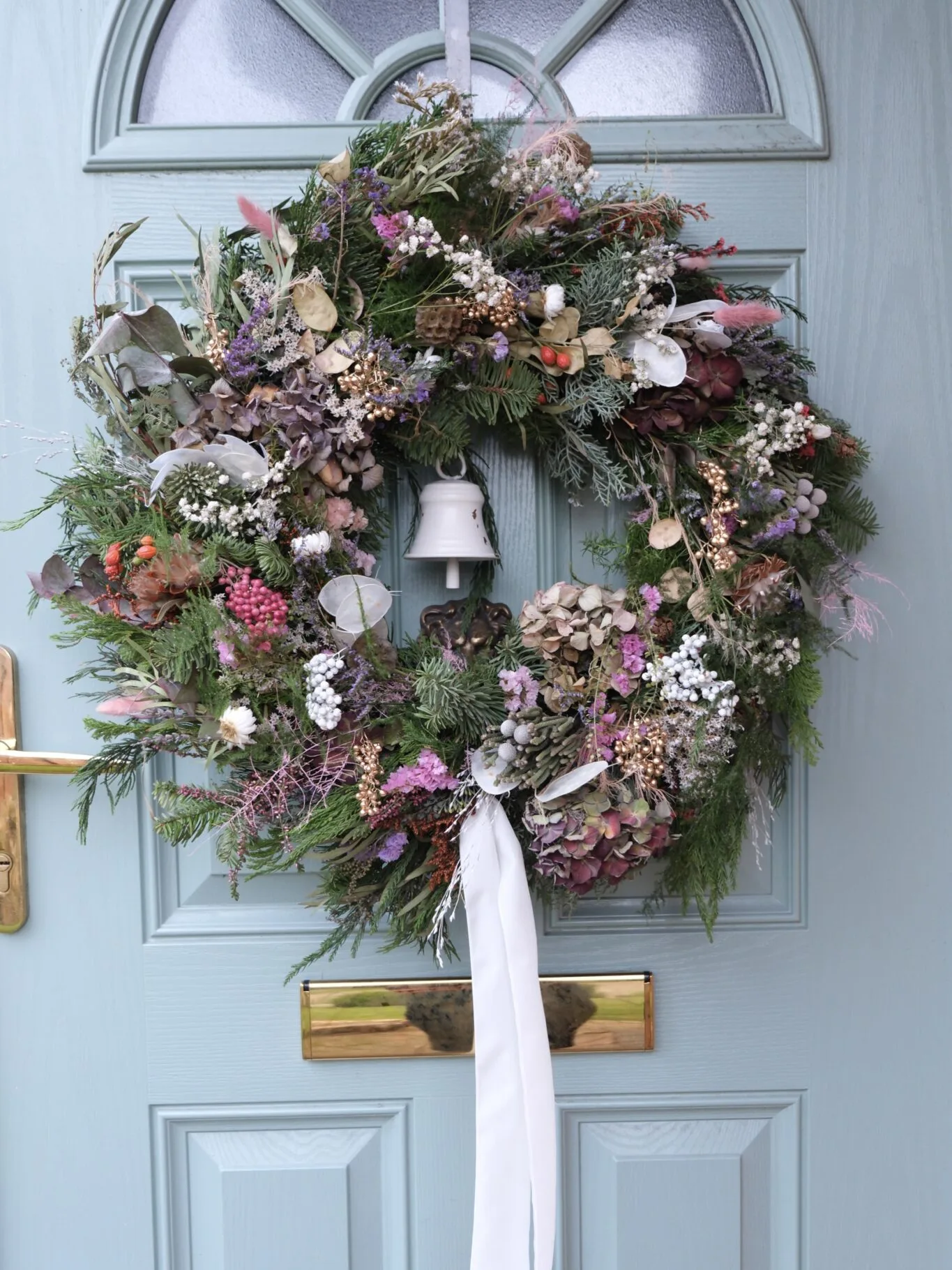 Our ‘Rustic Luxe’ wreath is our most luxury edition, new to 2025 packed with tonal dried florals amongst fresh foliage. This design comes with a white toned bell.