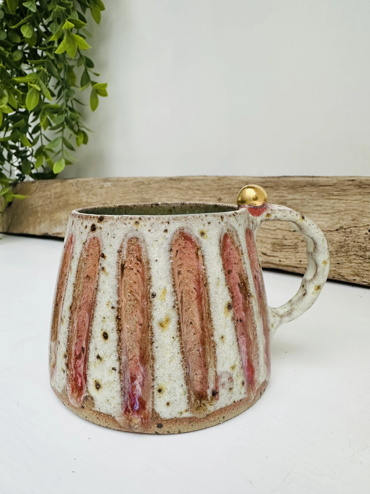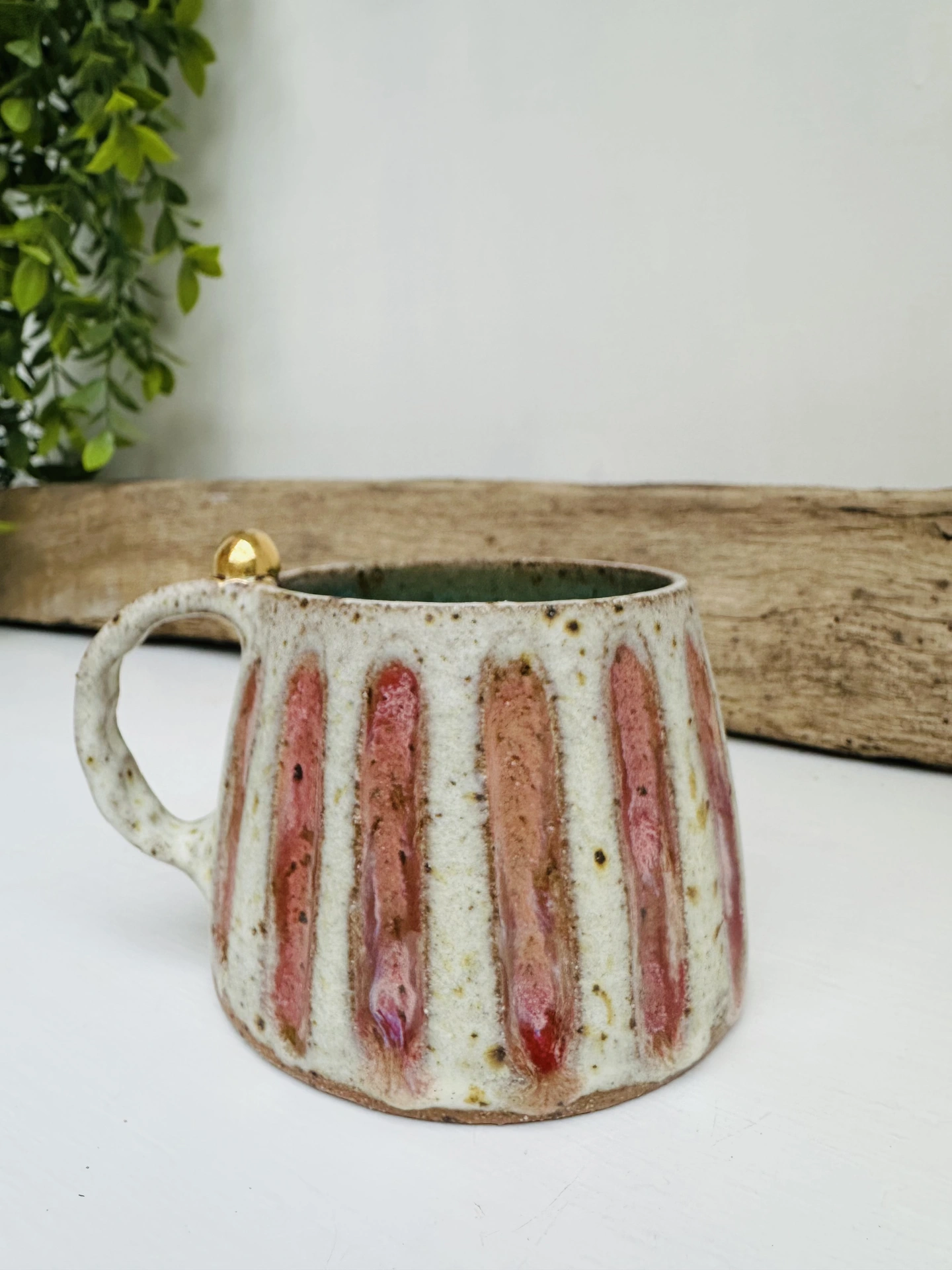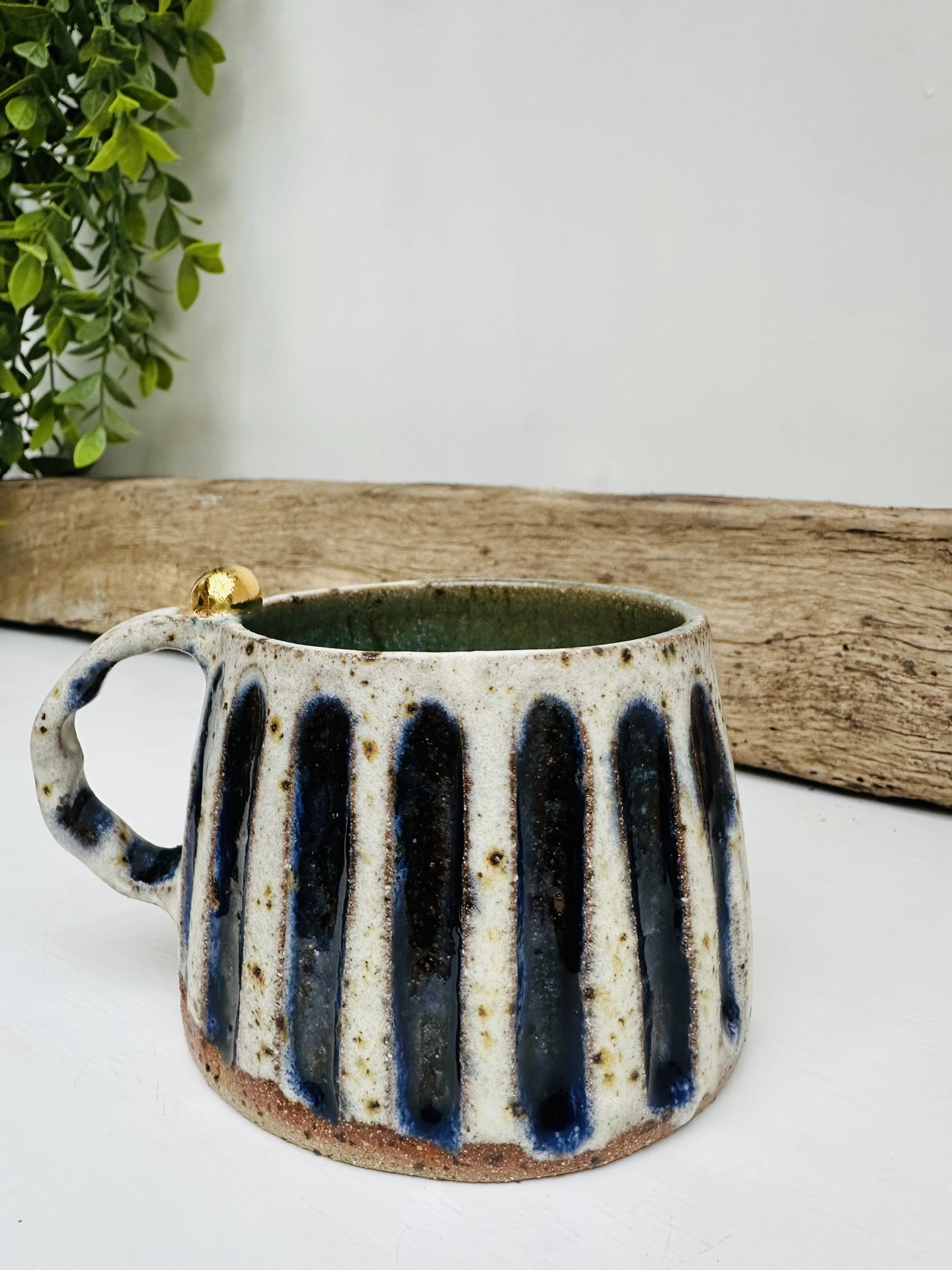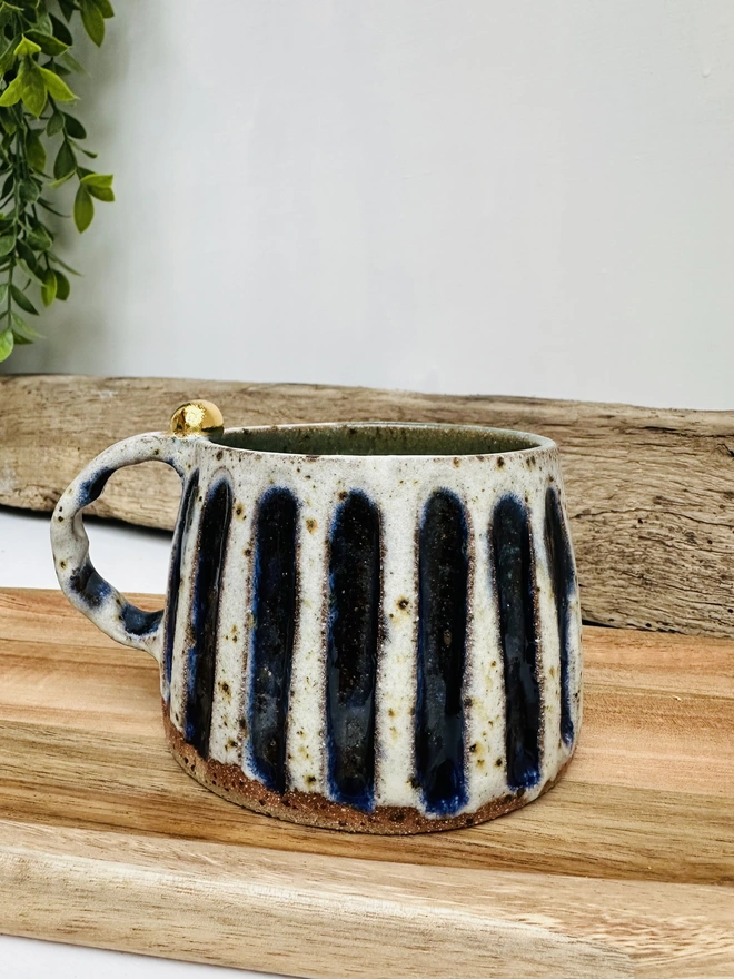 These handmade ceramic mugs features a stunning rustic glaze mixed with a modern gloss for a wonderful pop of colour. The handles have a tactile feel, capped off with a mini sphere in 24k gold lustre - meaning each cup is fired three times.