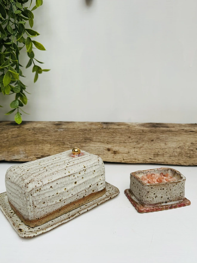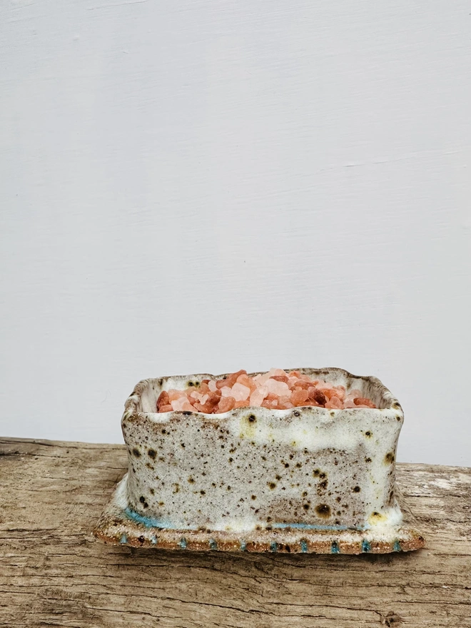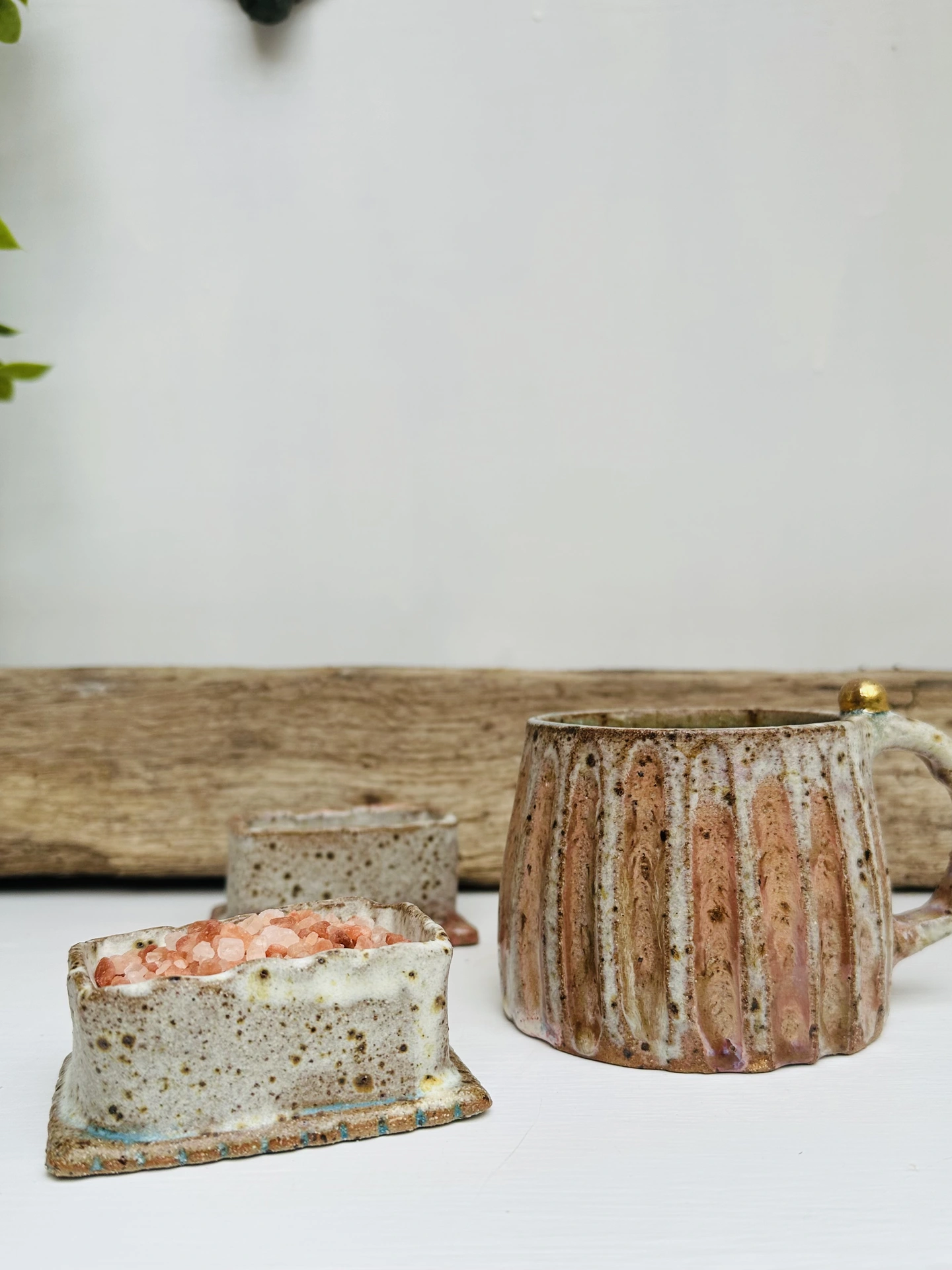 This small oblong ceramic dish is perfect for serving salt at the table or keeping beside the stove while cooking. The gently scalloped edge along the base adds a subtle decorative detail while keeping the form simple and functional. Finished in a rustic cream glaze, the natural speckle of the clay shows through, giving each piece depth and character. A soft hint of pink or blue around the base adds a delicate touch of colour, making every dish feel unique.
