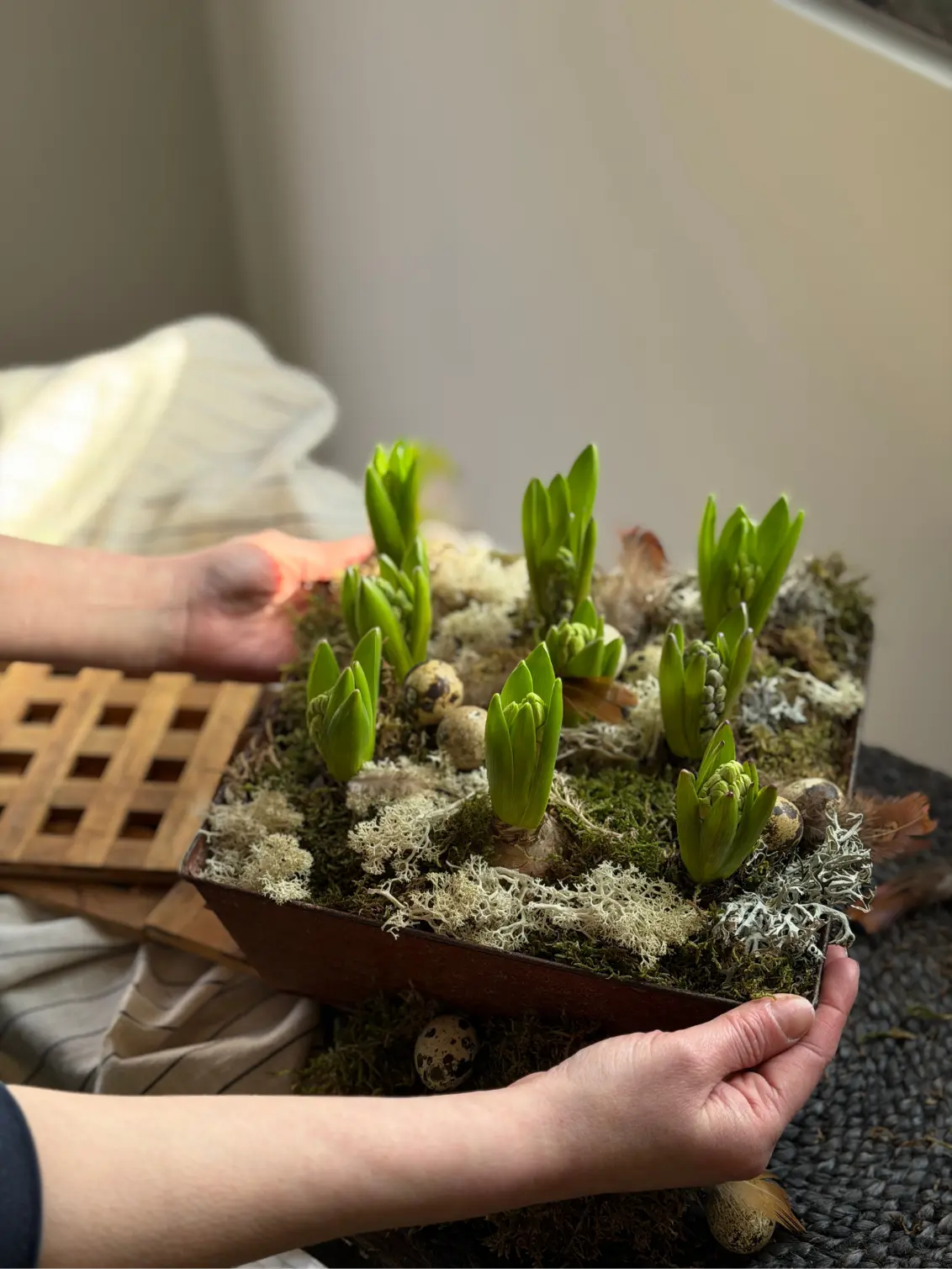 The planter is finished with mixed natural mosses and delicate spring accents, adding texture, colour, and a woodland garden feel. As the hyacinths bloom, they fill the space with their signature sweet fragrance and vibrant spring colours, making this piece a perfect seasonal centrepiece or thoughtful gift.
