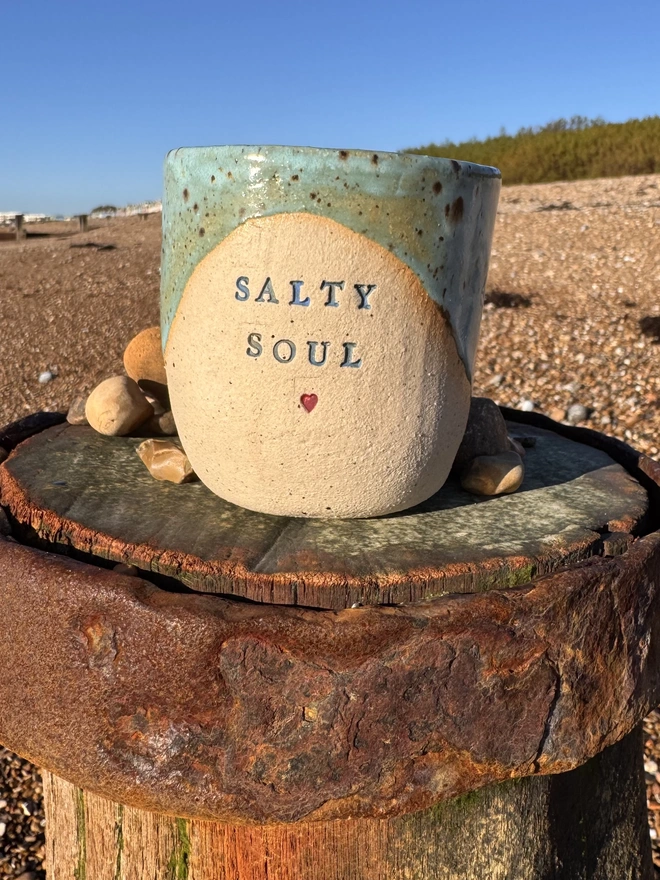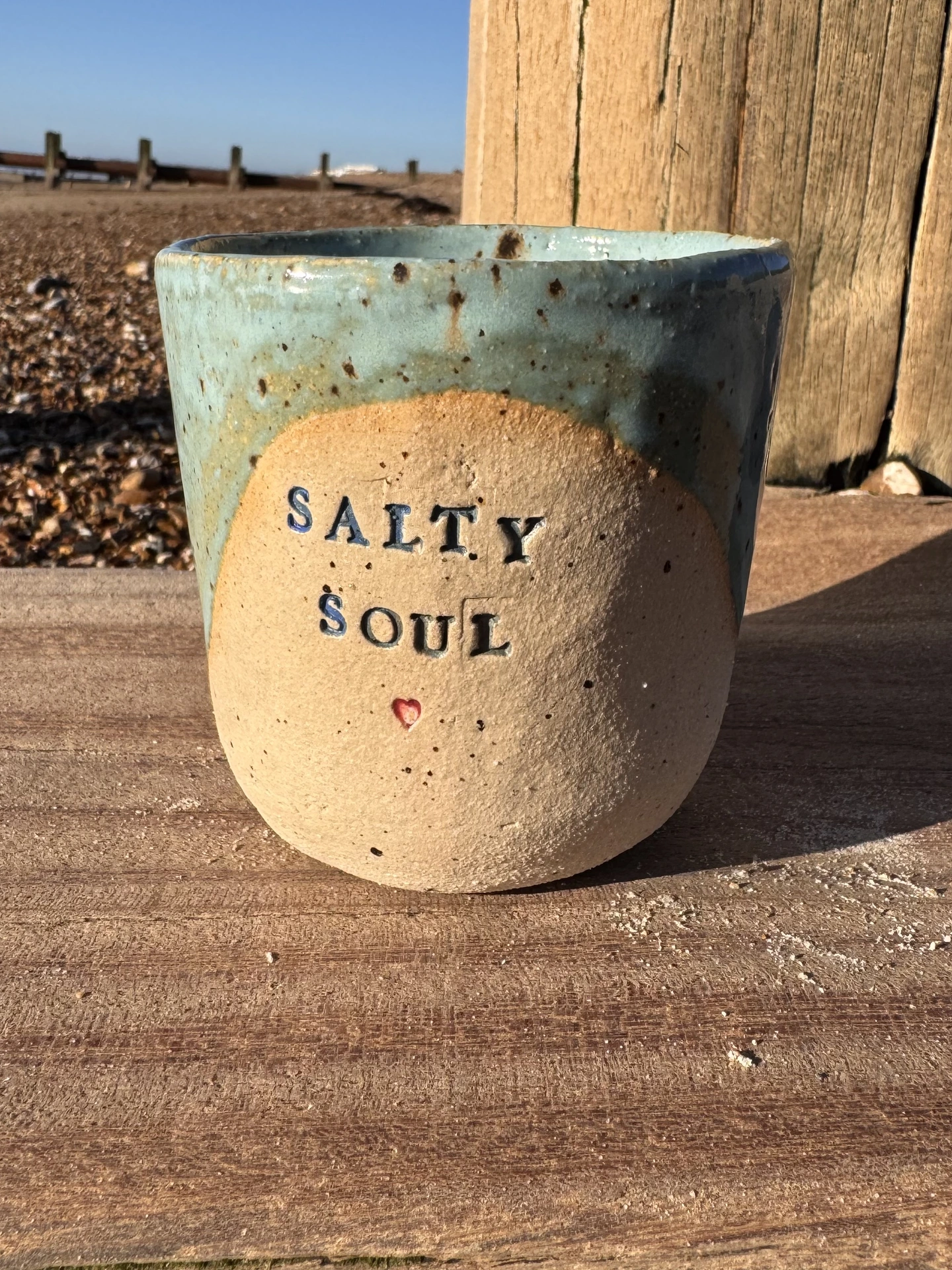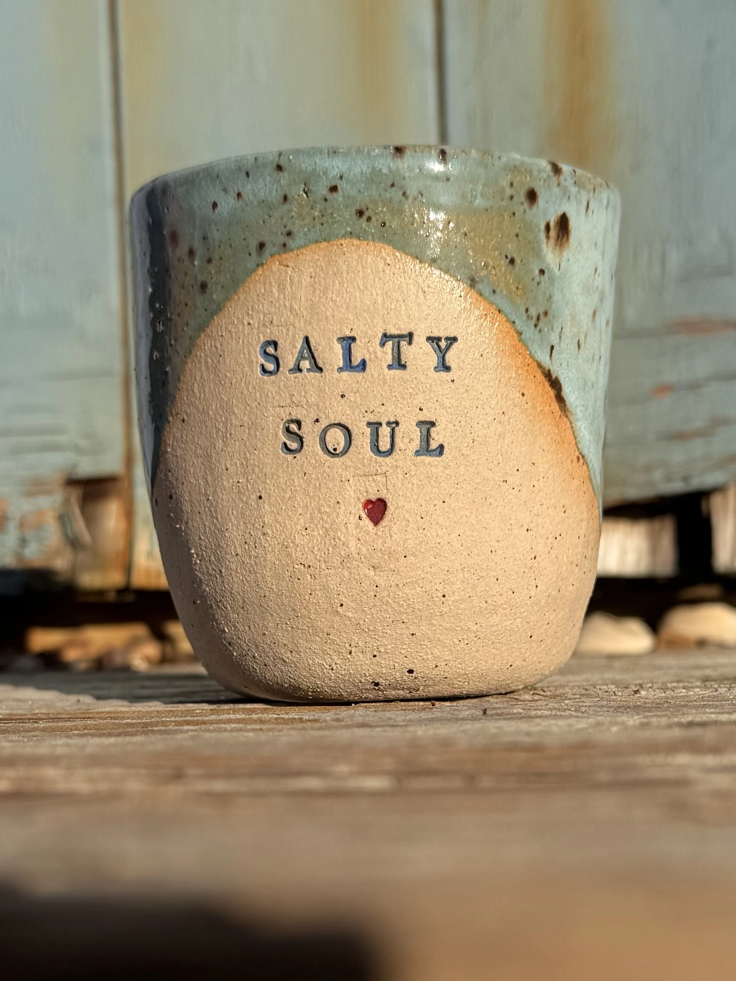 This is a lovely coastal style hand built ceramic stoneware tumbler. This organic shaped mug is perfect for your morning latte or americano! Made with speckled clay and imprinted with the phrase ‘Salty Soul’ and then decorated with a beautiful flecked turquoise glaze to match a clear holiday sea