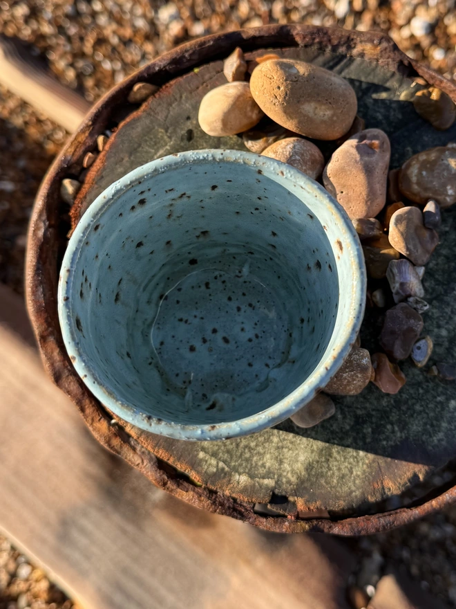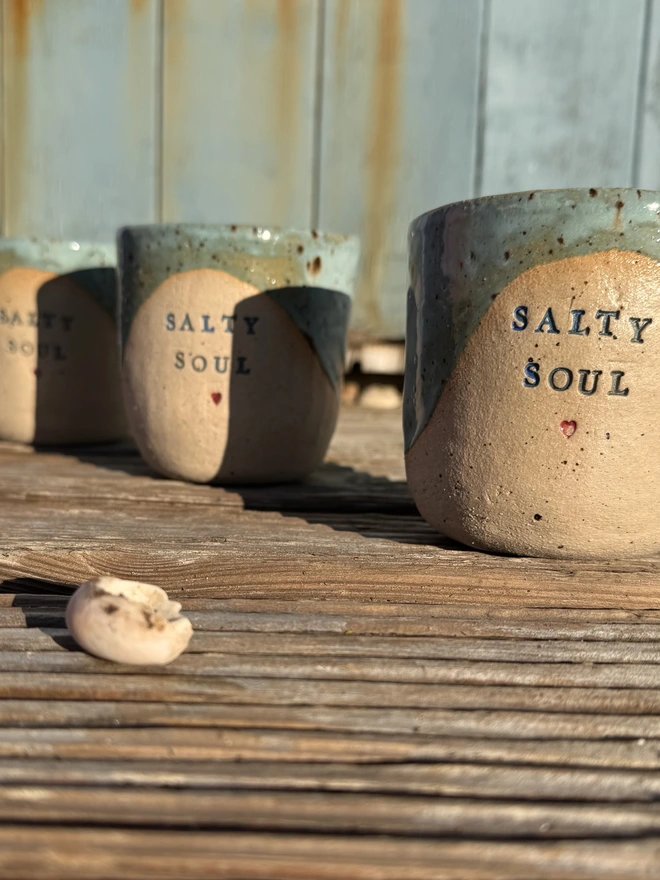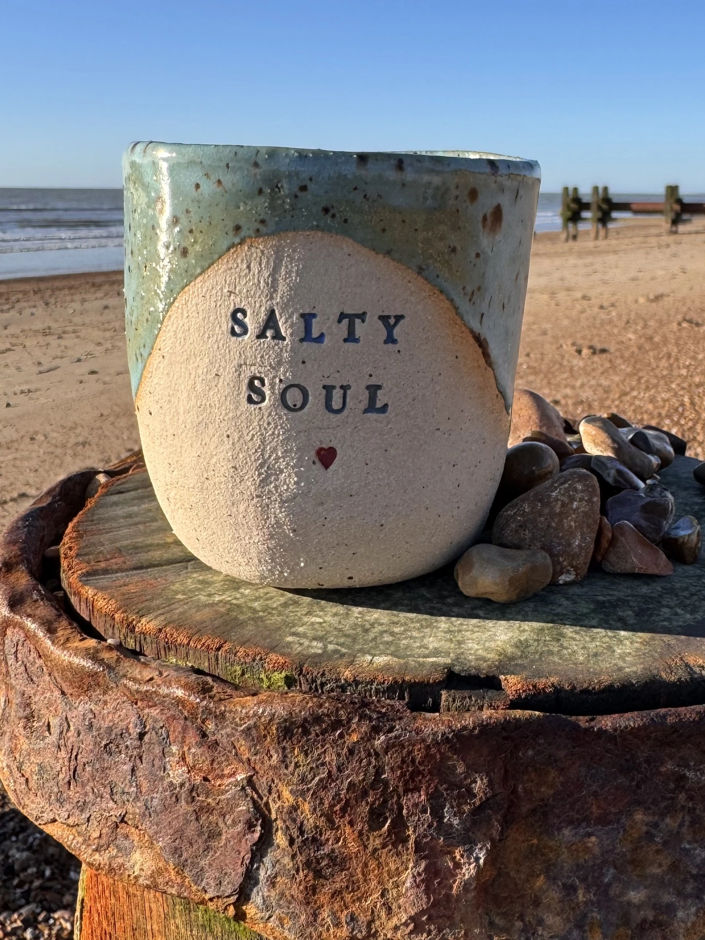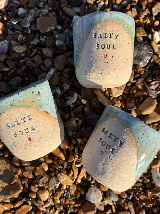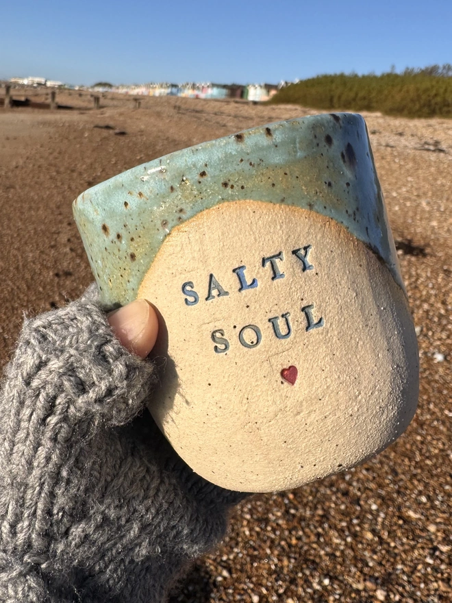 This is a lovely coastal style hand built ceramic stoneware tumbler. This organic shaped mug is perfect for your morning latte or americano! Made with speckled clay and imprinted with the phrase ‘Salty Soul’ and then decorated with a beautiful flecked turquoise glaze to match a clear holiday sea