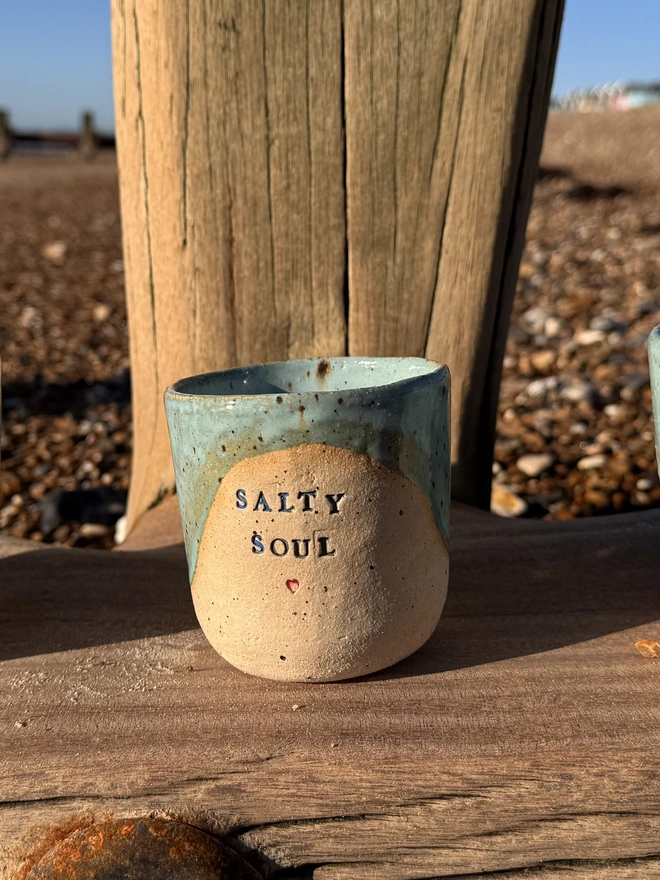 This is a lovely coastal style hand built ceramic stoneware tumbler. This organic shaped mug is perfect for your morning latte or americano! Made with speckled clay and imprinted with the phrase ‘Salty Soul’ and then decorated with a beautiful flecked tur...