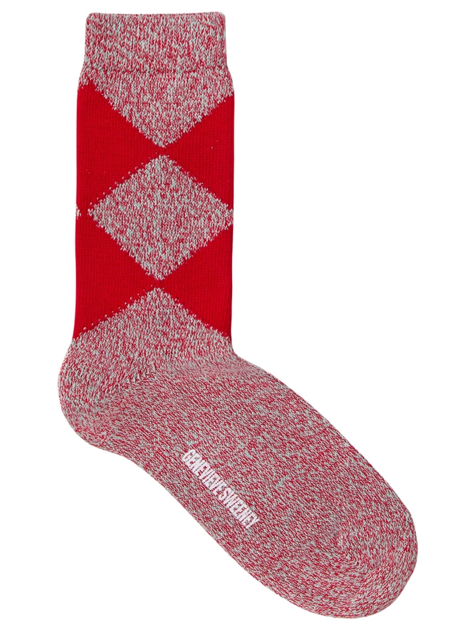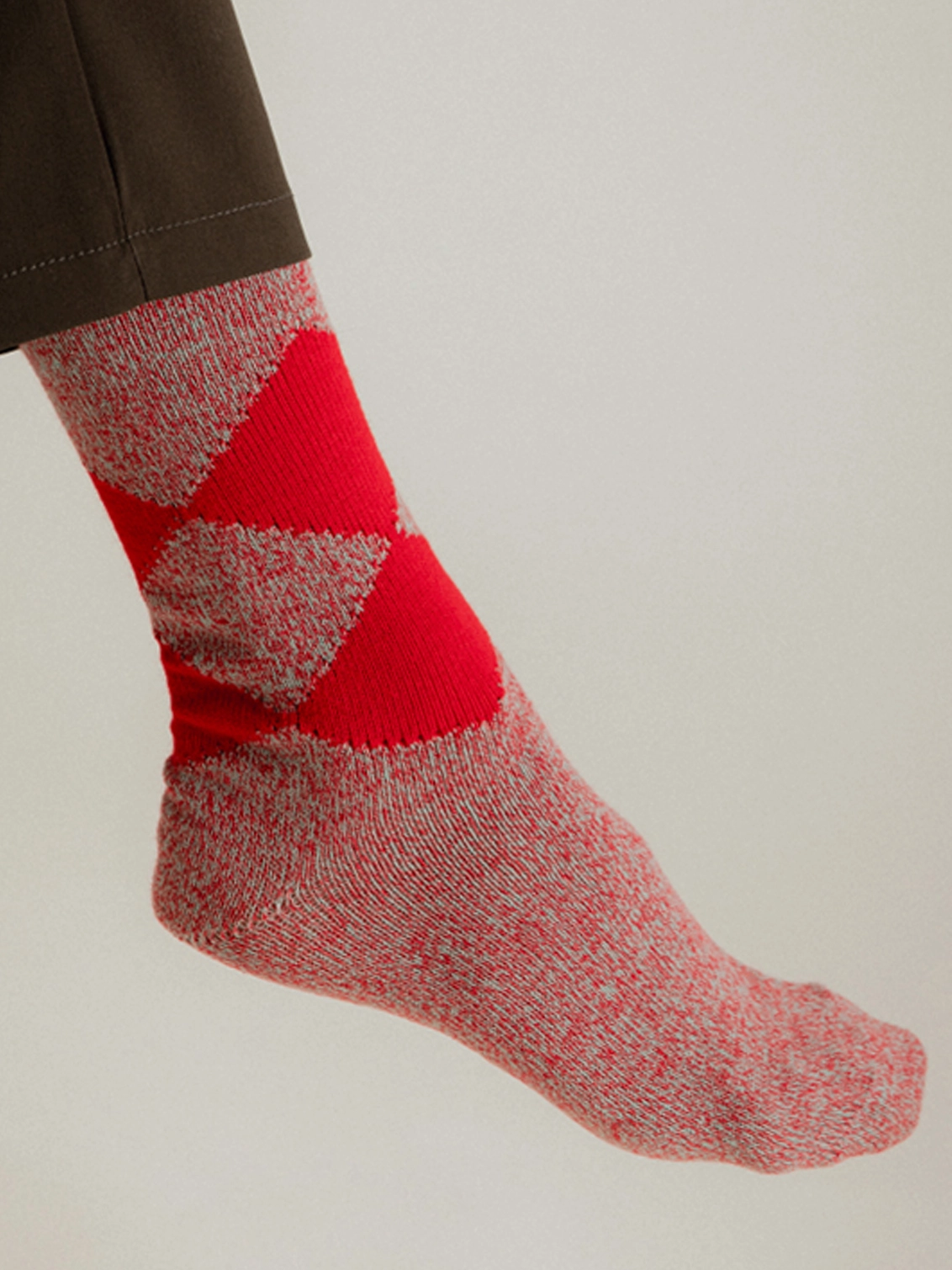 Crafted by twisting together discontinued and end-of-line yarns, the Samar Argyle socks for men and women are made from a custom-spun organic cotton marl in red. These stylish everyday socks are given a stylish twist with contrasting argyles for a modern twist on the traditional argyle socks.