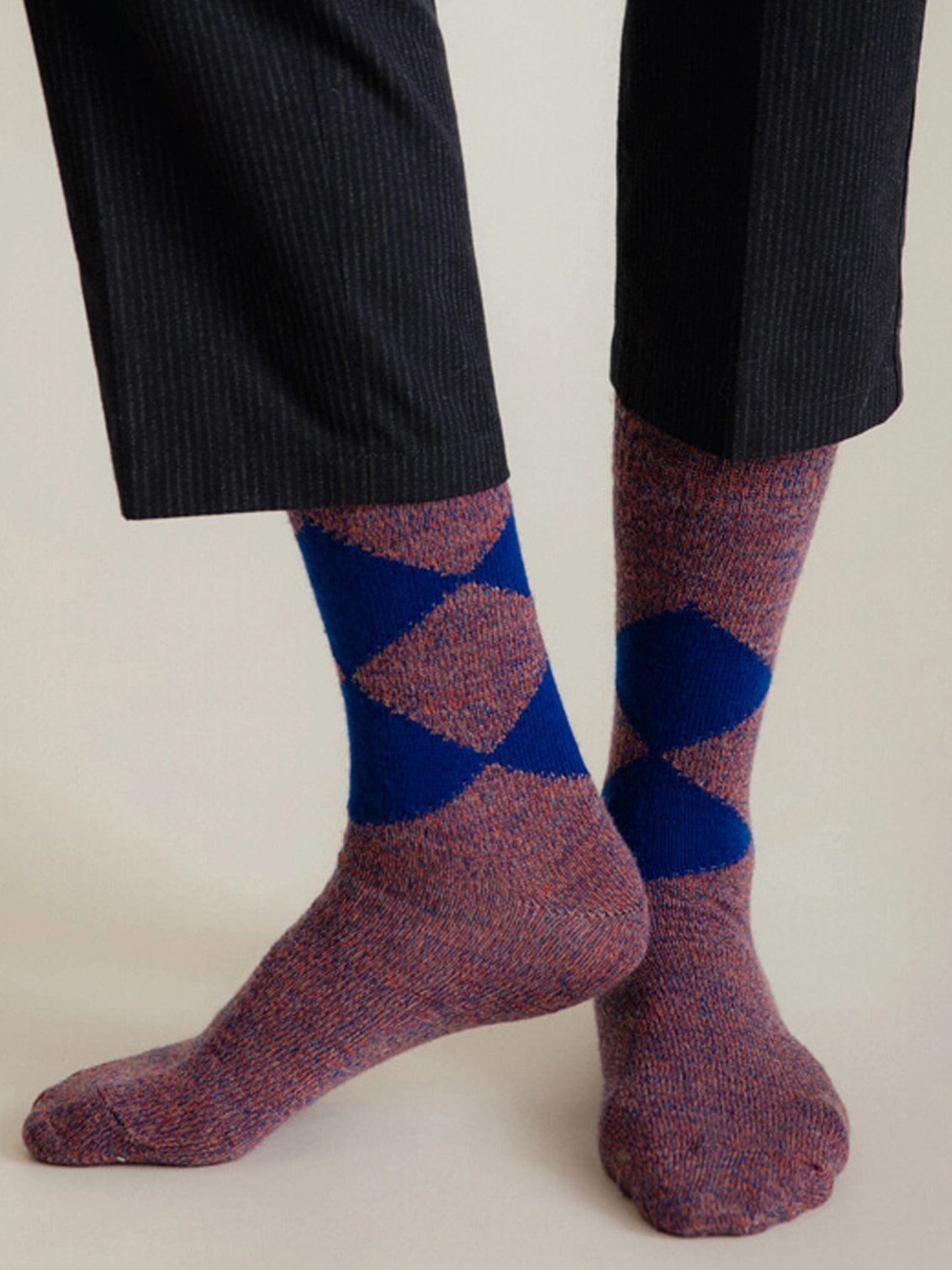 Crafted by twisting together discontinued and end-of-line yarns, the Samar Argyle socks for men and women are made from a custom-spun merino wool marl in blue and orange. These stylish everyday socks are given a stylish twist with contrasting argyles for a modern twist on the traditional argyle socks.