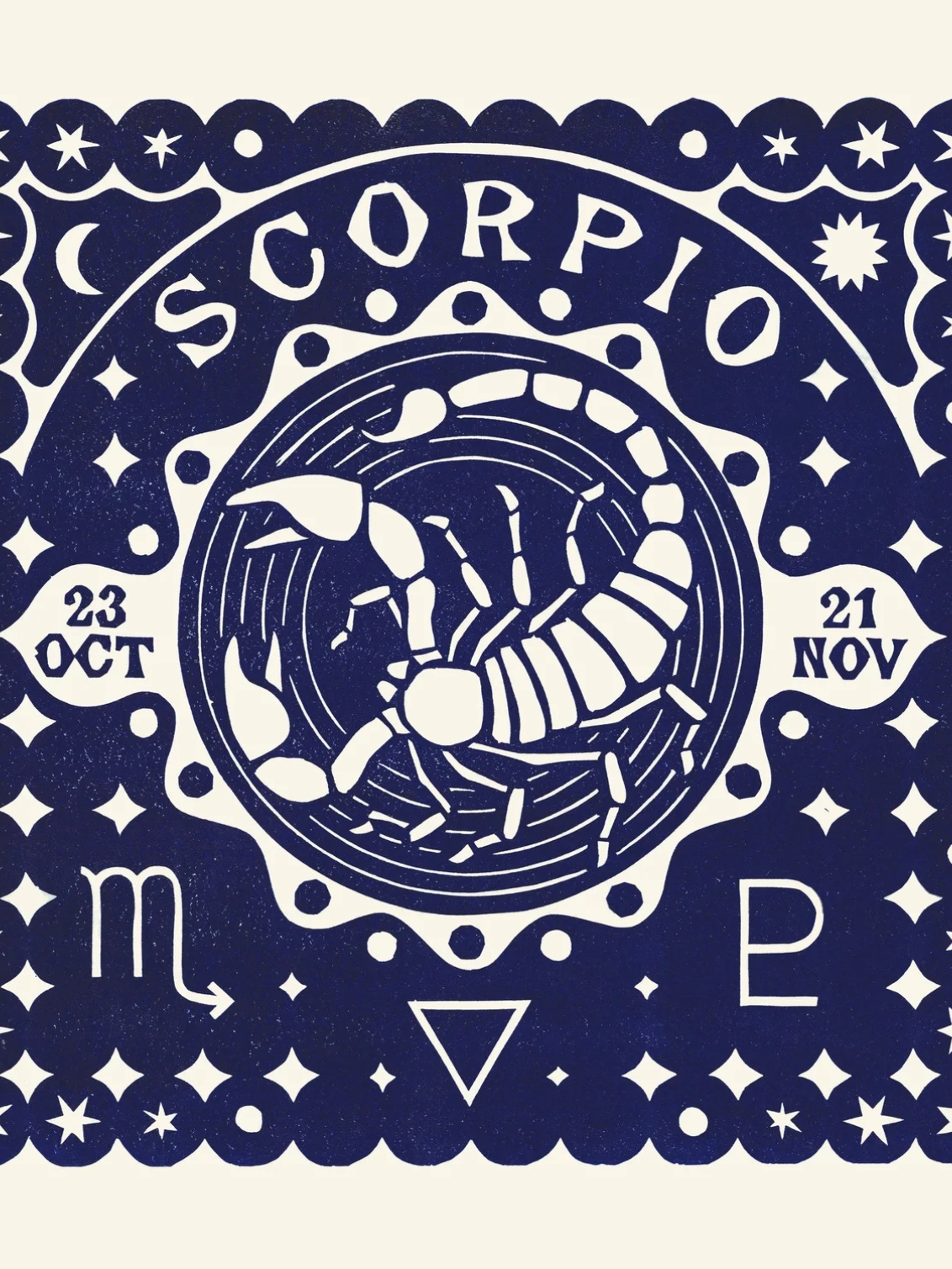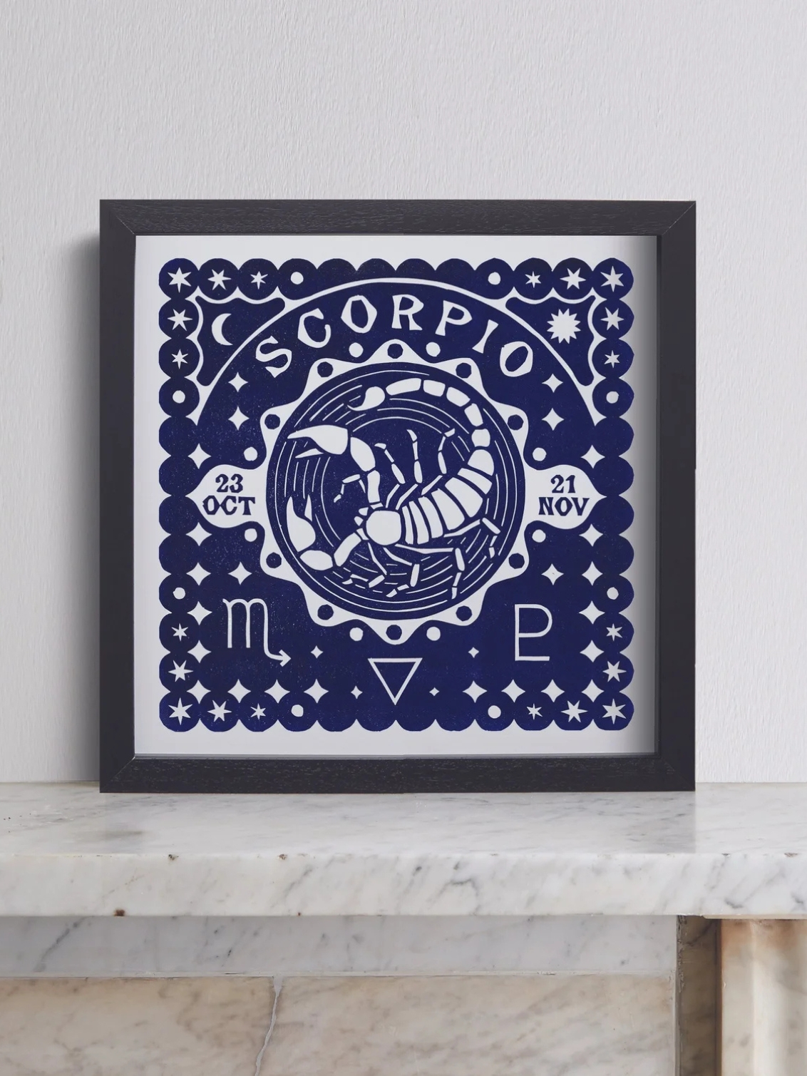 Shown on this print is an approximate date span for Scorpio of October 23 – November 21. The dates may vary slightly each year due to Earth's orbit and leap years, so those born near the start or end should check their birth chart to confirm their sign.
