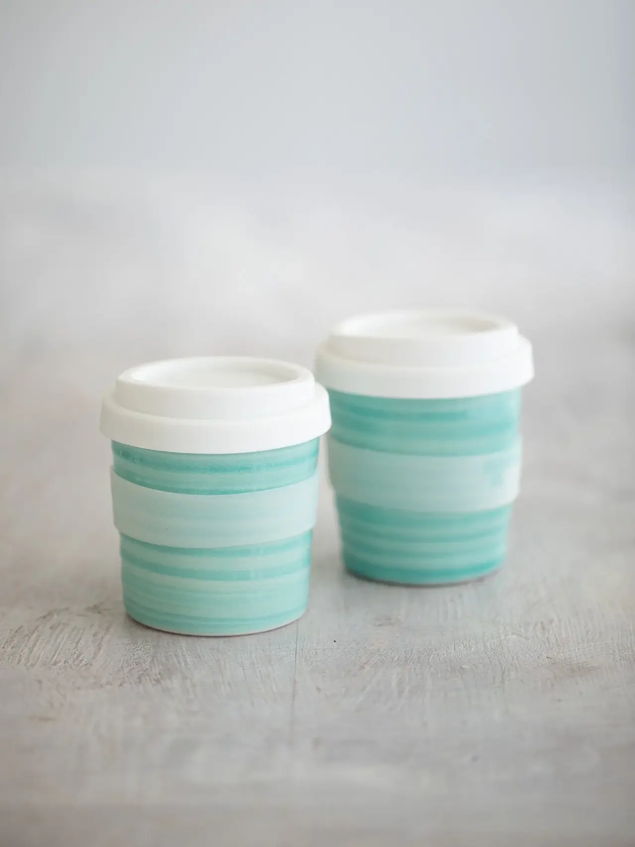 This eco-cup holds just over 8oz of your favourite beverage. Thrown on the wheel in luxury porcelain clay, comes with white silicone lid and transparent band to protect your hands from the heat. (Both can go in the dishwasher).