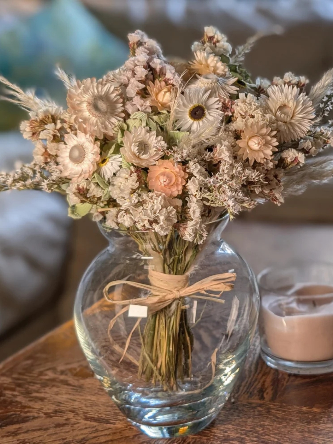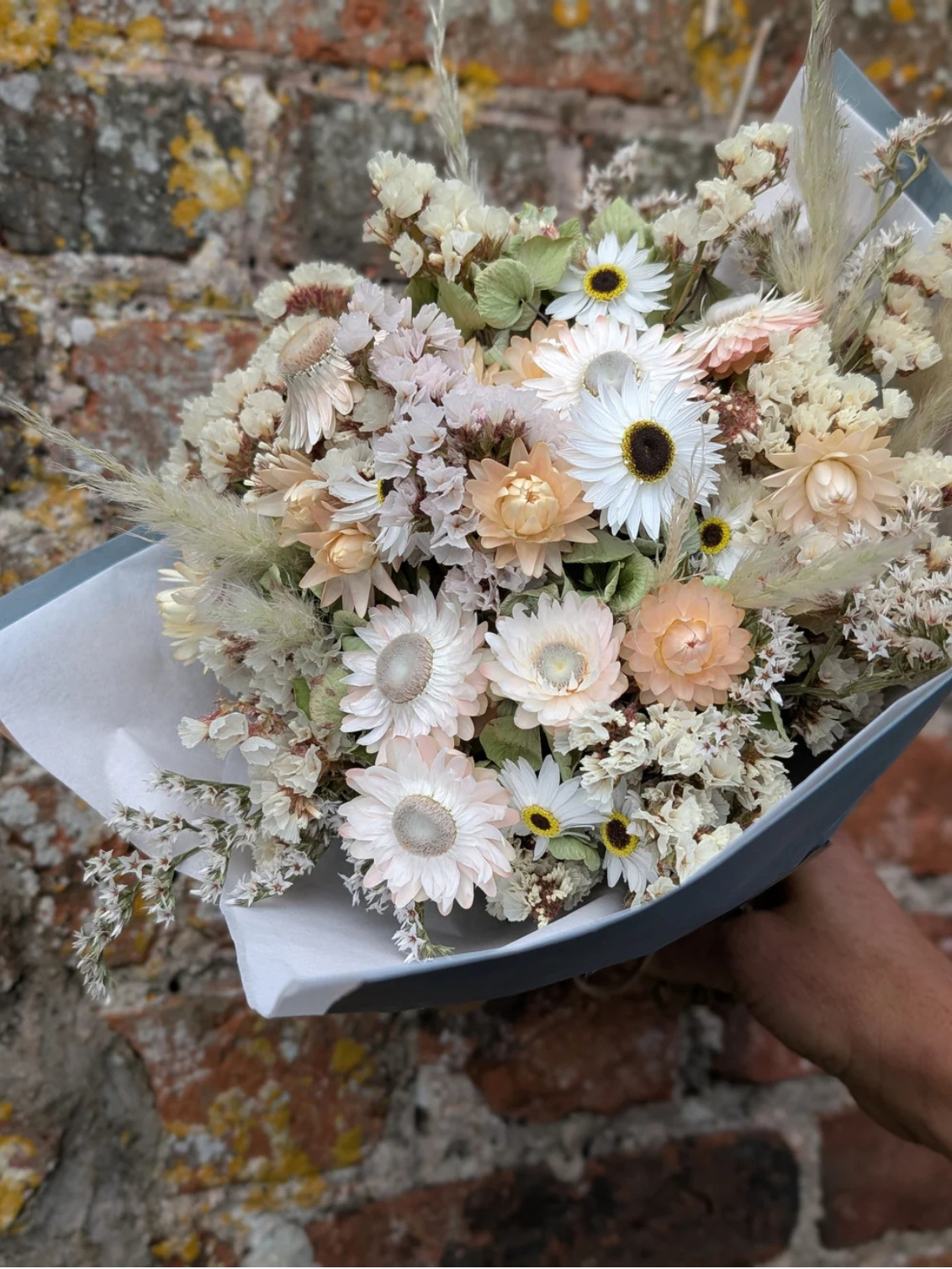 A mix of dried flowers including Sea Lavender, Strawflowers, grasses and Sea Spray, mixed in with delicate hydrangea florets.
