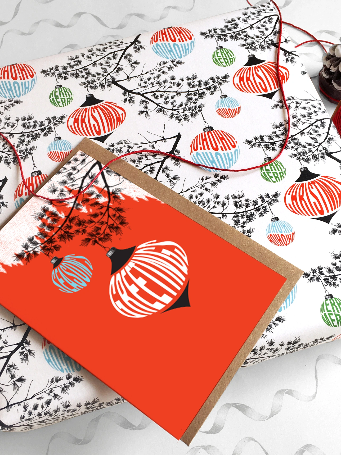 Baubles & Boughs' is a retro, stylish and contemporary range of Christmas wrapping and greetings cards with a graphic modern feel. Inspired by the crisp, cool landscapes of frosty, winterland scenery and nostalgic ornaments and decorations, the colour schemes echo a simpler time, harking back to mid-century printing techniques and retro typography with a subtle oriental design influence.