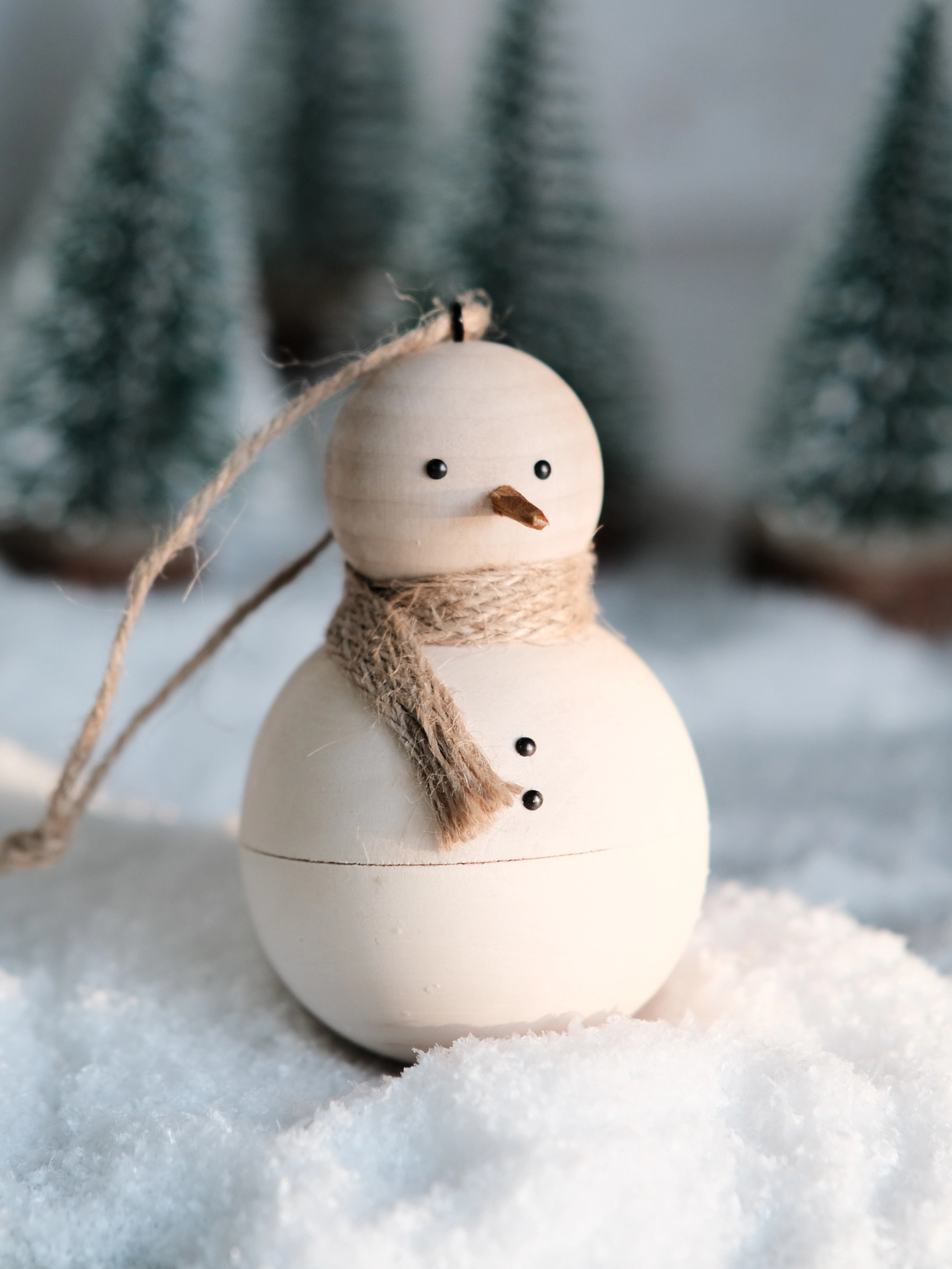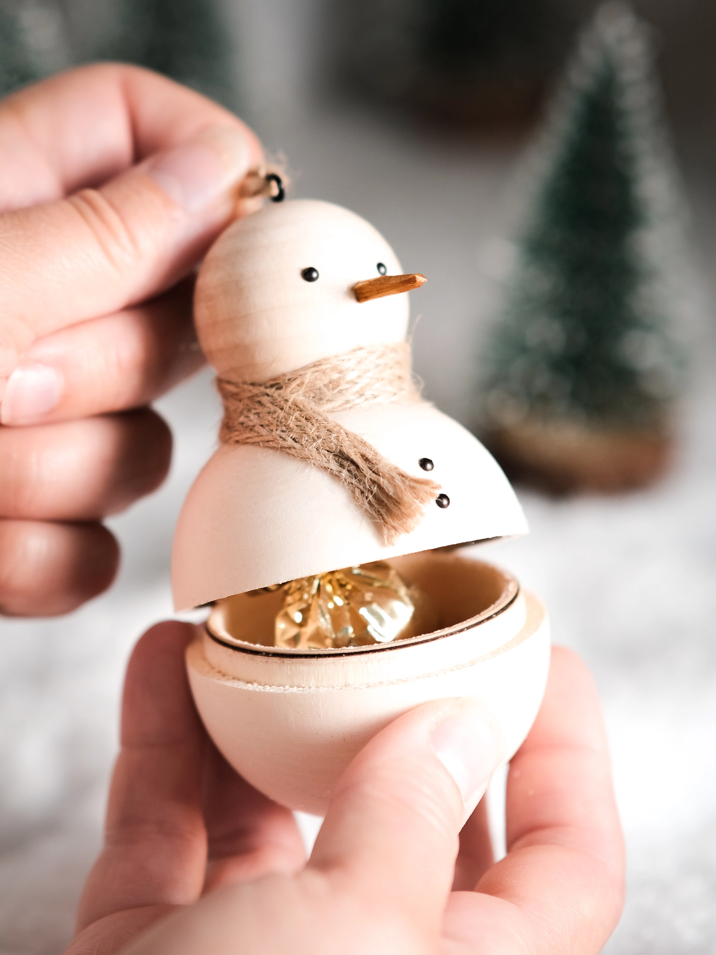 Carefully crafted from smooth wood and finished with a simple twine scarf, this cheerful little snowman is more than just cute—he's hiding a secret.