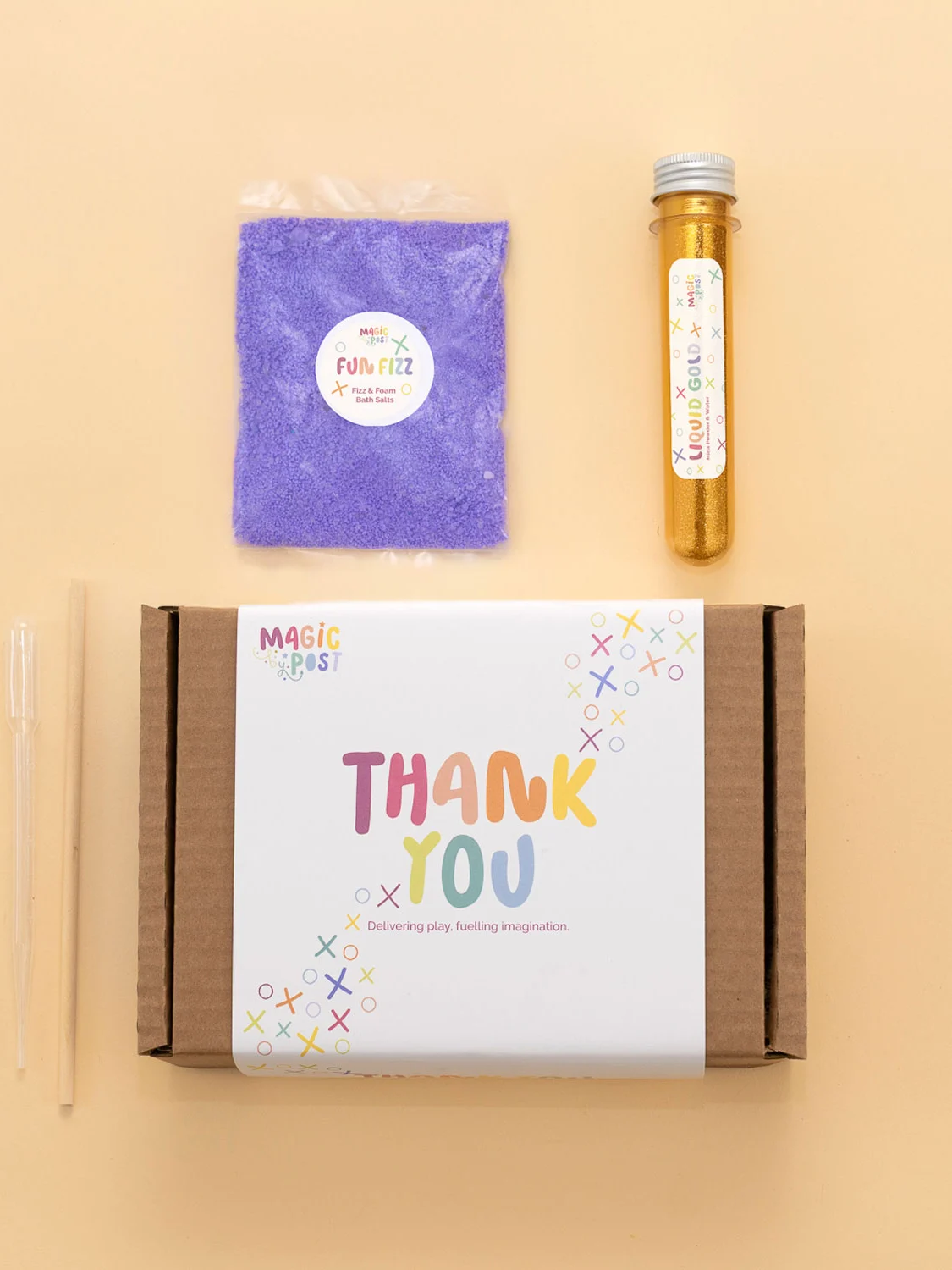 Say thank you with a sprinkle of magic! The Party Box is the ultimate children’s party favour – a delightfully curated mini potion set that lets guests take home their very own box of imaginative fun. Bursting with colour, fizz, and sensory excitement, each box invites kids to continue the magic long after the party ends.