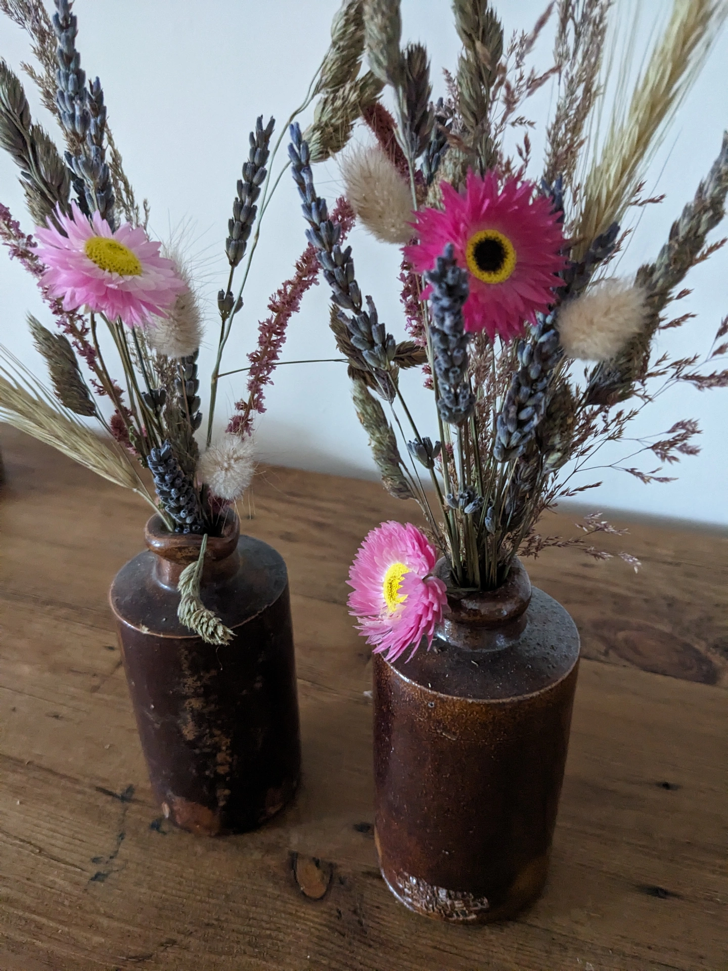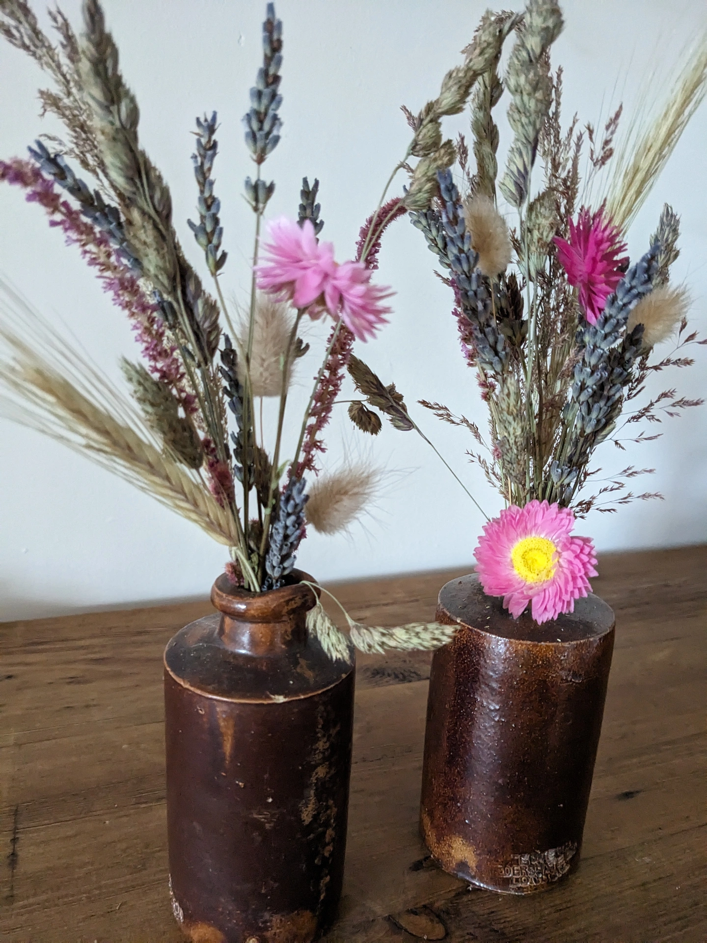 Set of 2 Vintage Stoneware Vases with Dried Flowers/statice