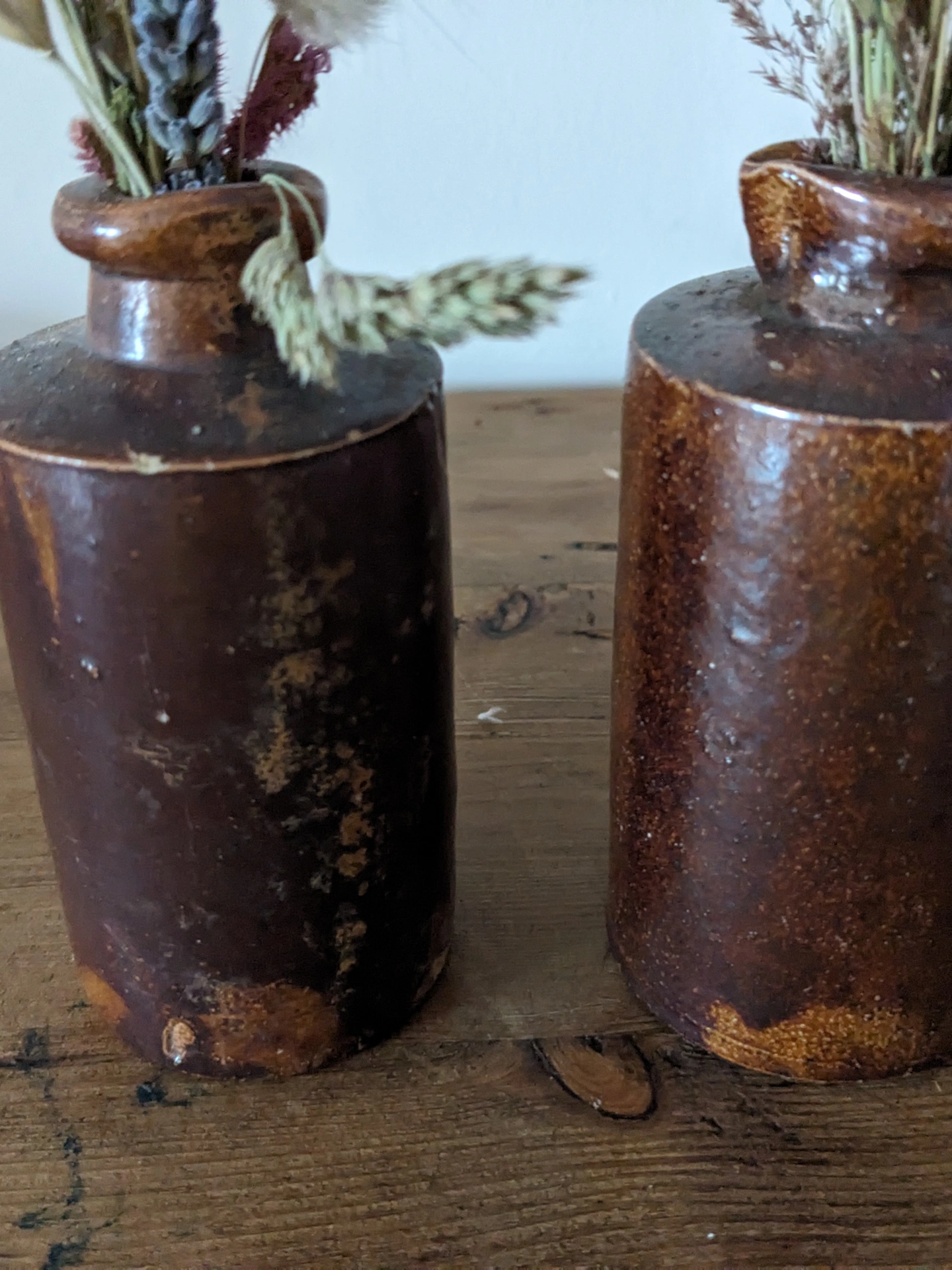 Set of 2 Vintage Stoneware Vases with Dried Flowers