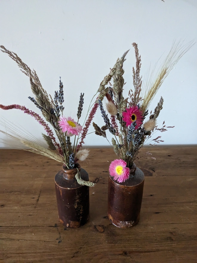 Add effortless rustic charm to your home with this set of two vintage stoneware vases in soothing, natural tones. Each vase is filled with a curated selection of dried flower stems, blending warm, earthy colours that bring a gentle seasonal touch to any room.