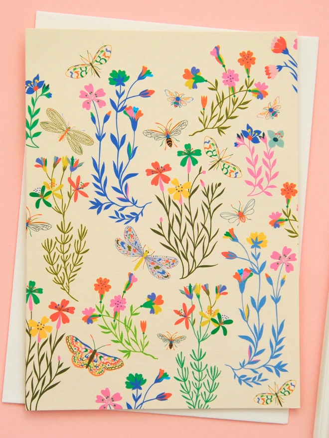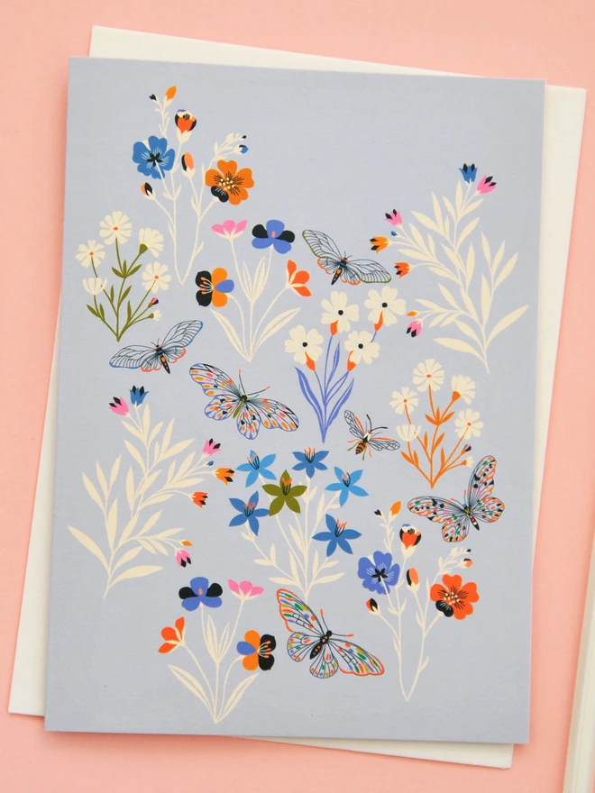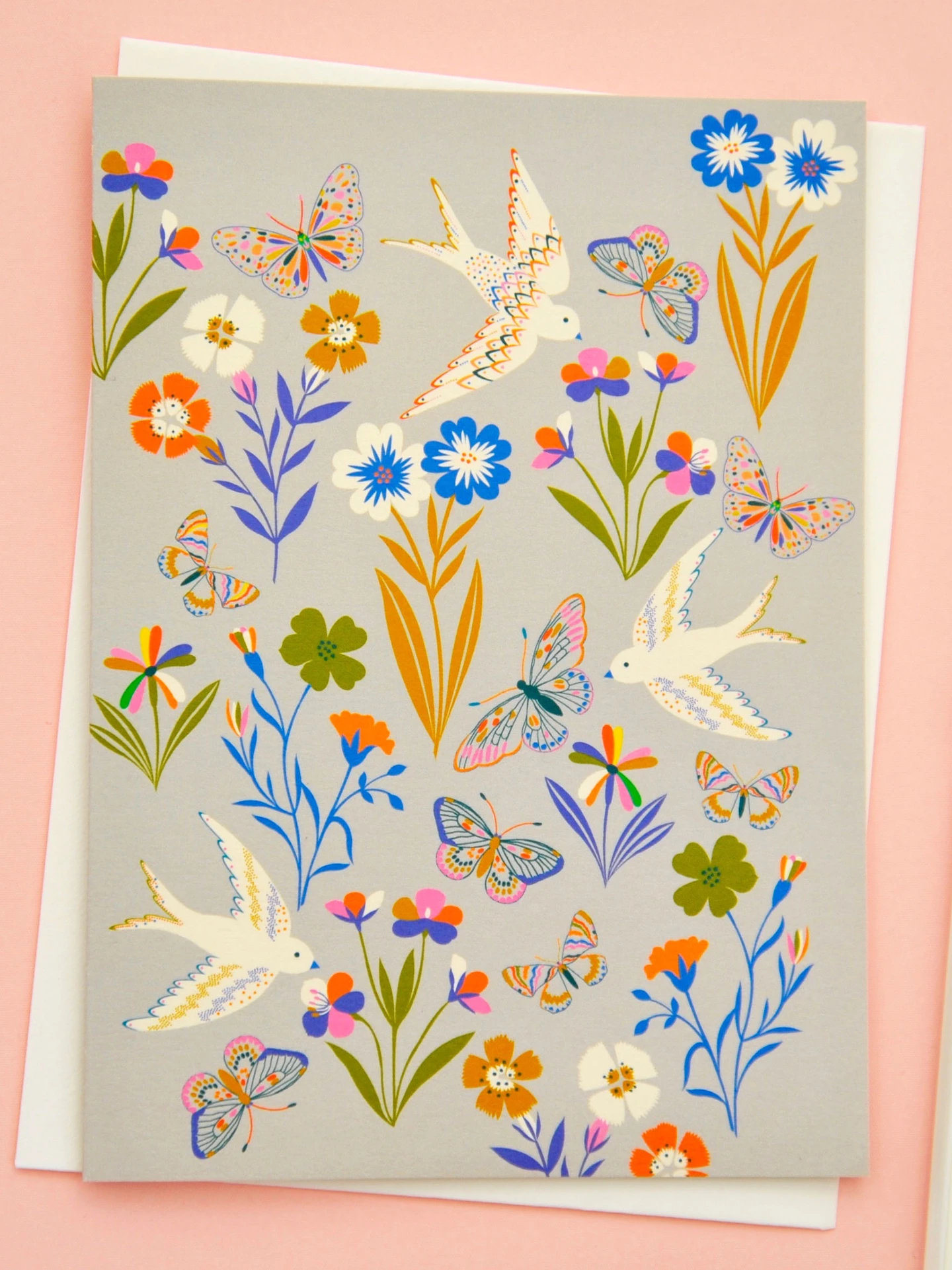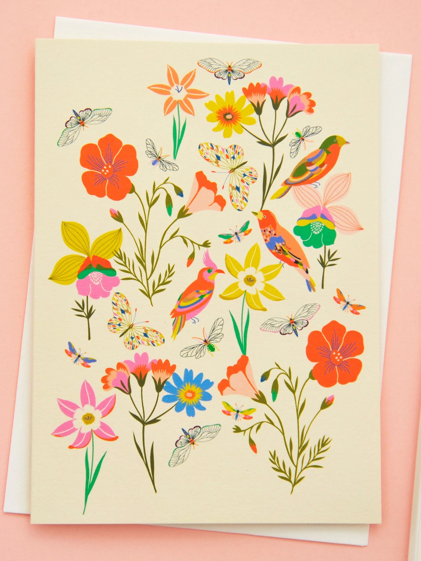 A vibrant set of four illustrated greetings cards featuring butterflies, birds and bees in a colourful nature inspired palette. Perfect for birthdays, thank yous or sending a thoughtful note.