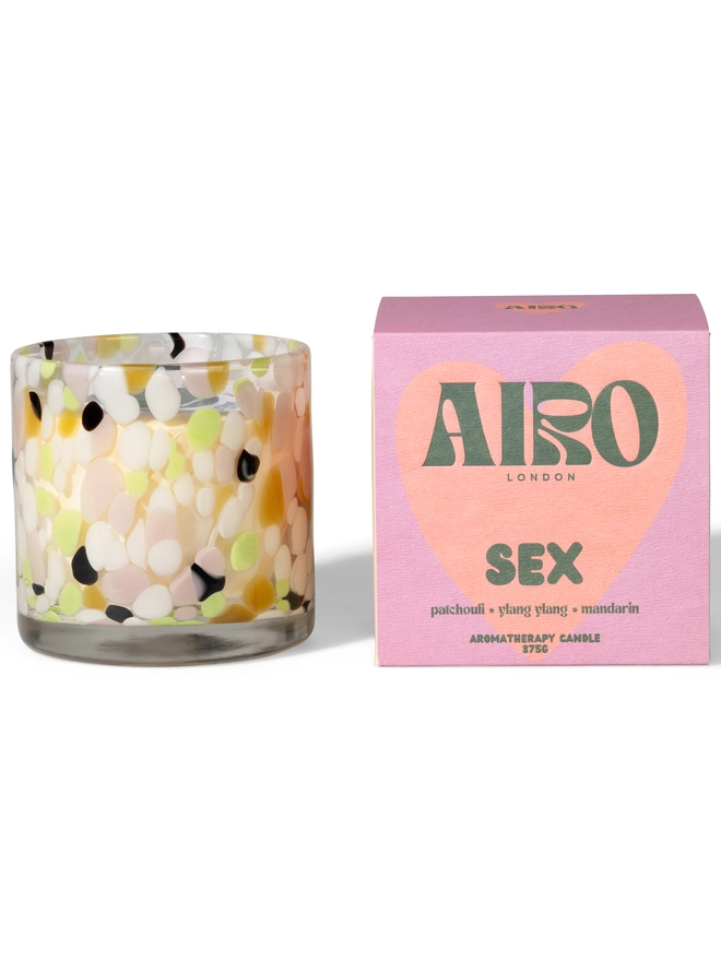 This blend provides a mix of positive energy and security to enable you to be confident in your own skin, relax and feel the passion. Using aromatherapy principles this candle aims to bring joy, relax and arouse the senses. Botanical soy wax candle & hand blown glass.