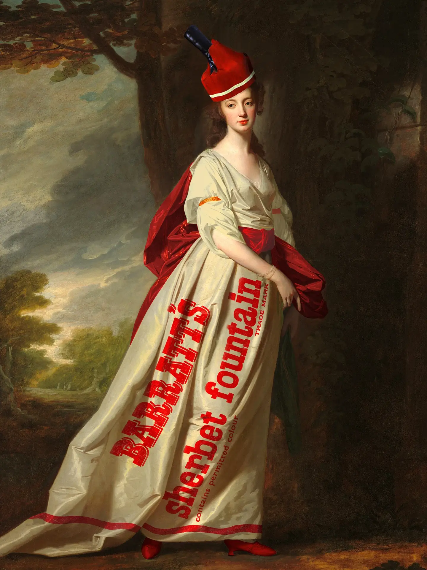 Part of a large ongoing series of works called The Product Placement Project. Humorous & fun Pop-Surrealist work exploring the connections and boundaries between art and advertising and a reflection on the functions of fashion & clothing.