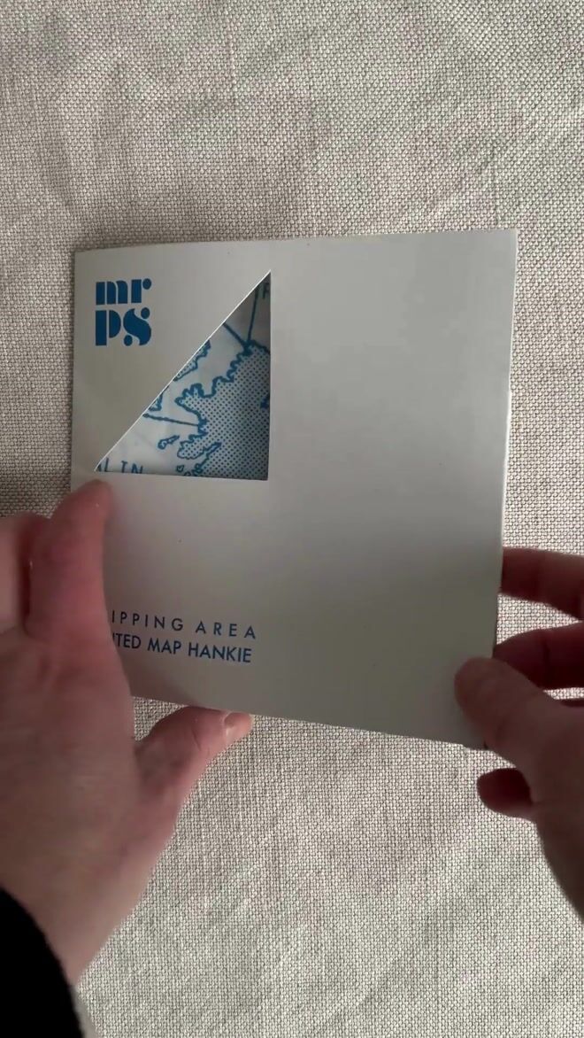 The individual handkerchief comes folded and packed in a recycled card wallet, which has a cut window to see the hankie in the front, the back has a overview of the whole design.