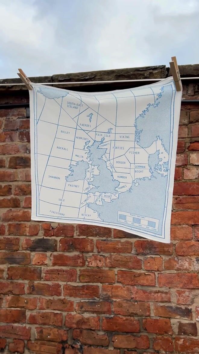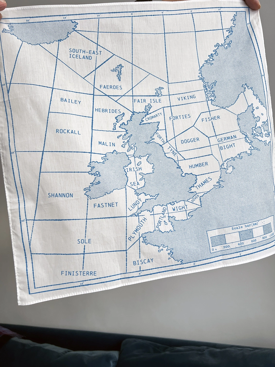 A printed cotton handkerchief featuring a vintage map of the UK shipping forecast areas around the coast of the British Isles and Northern European coastline...