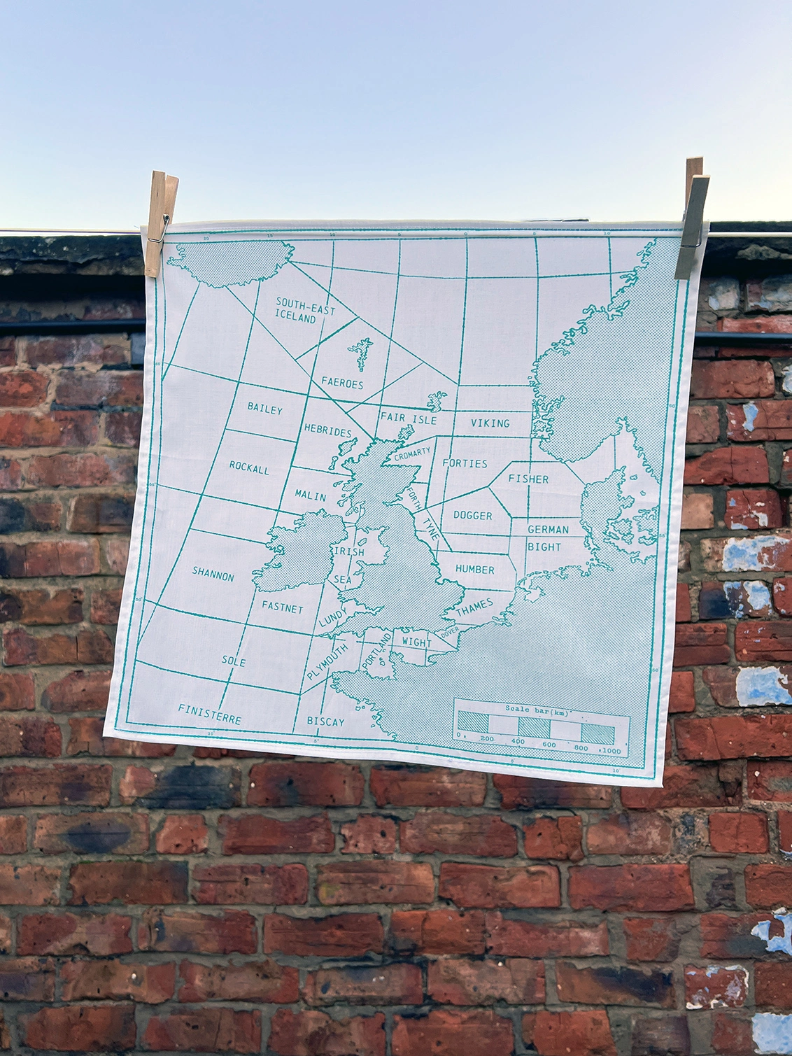 A printed cotton handkerchief featuring a vintage map of the UK shipping forecast areas around the coast of the British Isles and Northern European coastline.