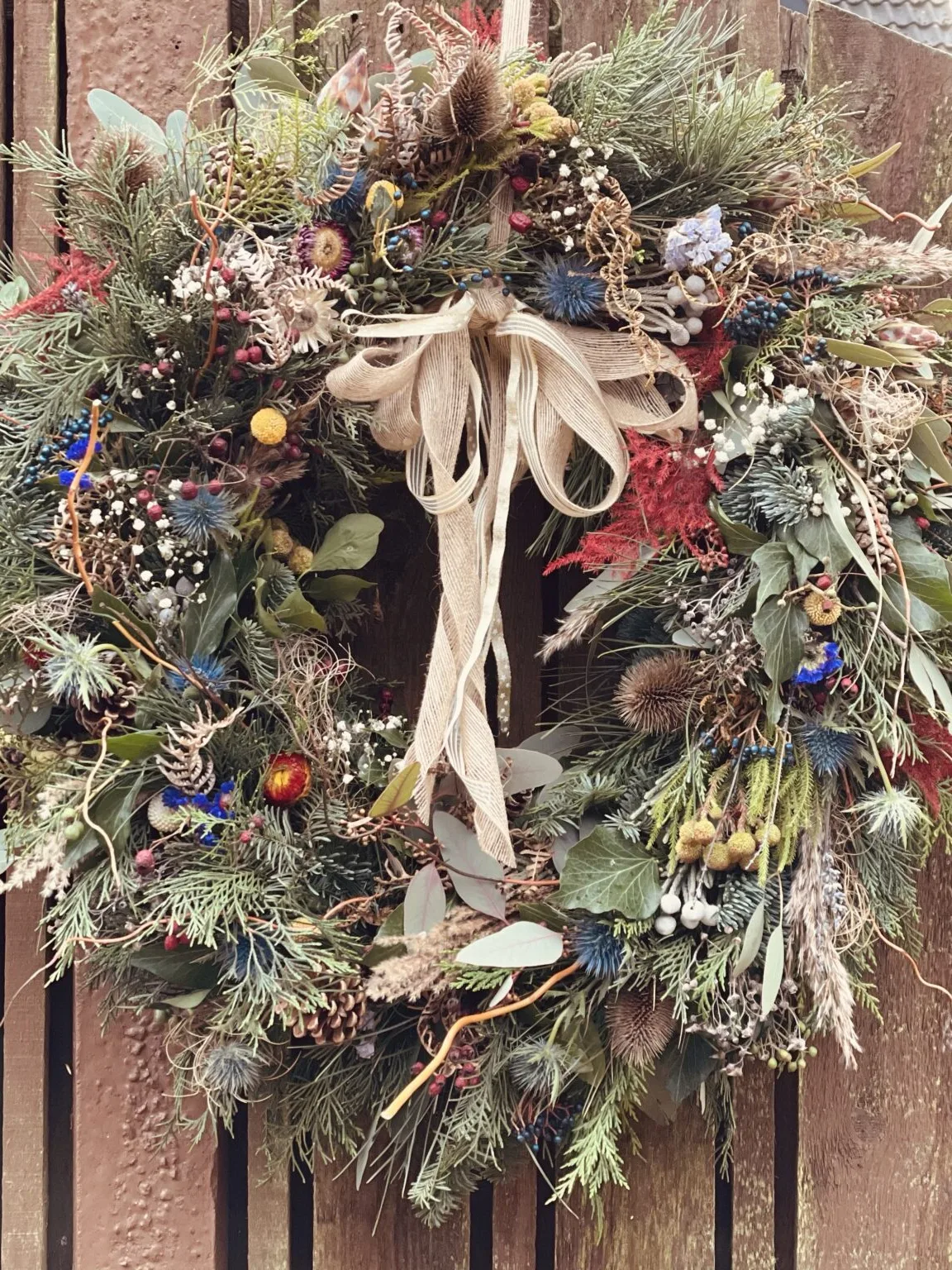 Our ‘Showstopper’ Christmas wreath is the ultimate festive door design, sure to be the envy of all your neighbours! This stunner is packed with so many textures using a vast array of different foliage and dried florals, including hydrangea, as well as pussy willow, pinecones, clematis, teasals and more!!