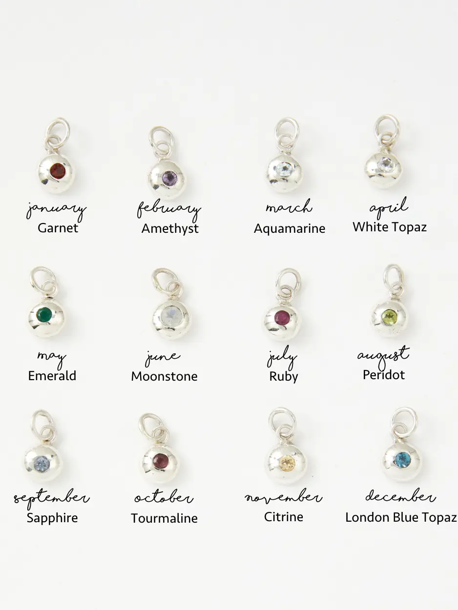 Hannah specially created the Darling Heart design and hand-stamps it onto our unique Silver Heart Pebble Necklace. Personalised with your choice of initial charm and birthstone. The pebble, inspired by a science experiment that Hannah used to teach, involving shaking a sugar cube inside the crisp tube would soften the edges. This mimicked the way water rounds and smooths pebbles on the beach or in a stream.
